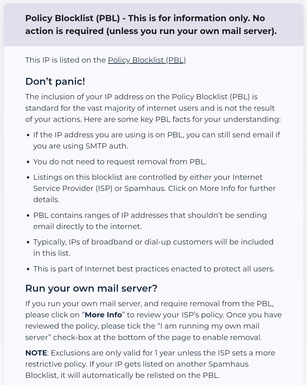 De PBL blacklist heeft trouwens niets te maken met dat er ooit spam verzonden is maar daar staat elk dynamisch IP-adres op.