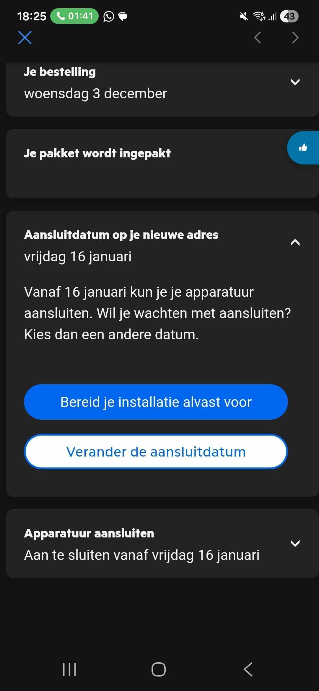 Ik kan de datum van de verhuizing niet eerder aanvinken via de ‘’bestelstatus’’ dan 16 jan 2026.