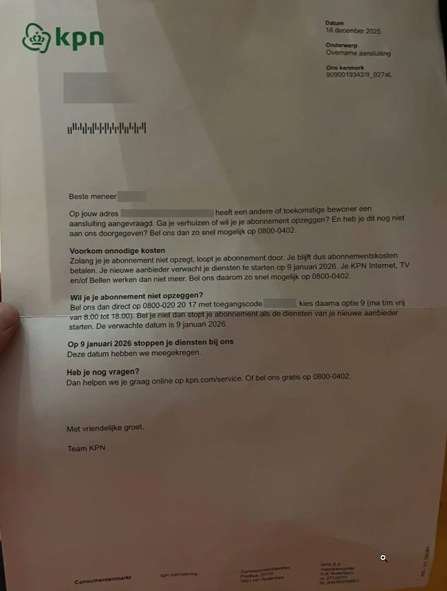 • In de bevestigingsmail ontvangen dat 9 januari 2026 de datum is en dat op 12 januari 2026 de verbinding stopt op het oude adres.
