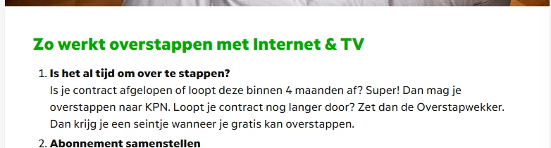 Wil je overstappen naar KPN, maar zit je nog vast aan een contract bij een andere provider? Geen zorgen! Met onze overstapwekker laat je zelf je gegevens achter en krijg je op het juiste moment een seintje met de beste deals. Zo kun je zorgeloos en op je eigen tempo overstappen.