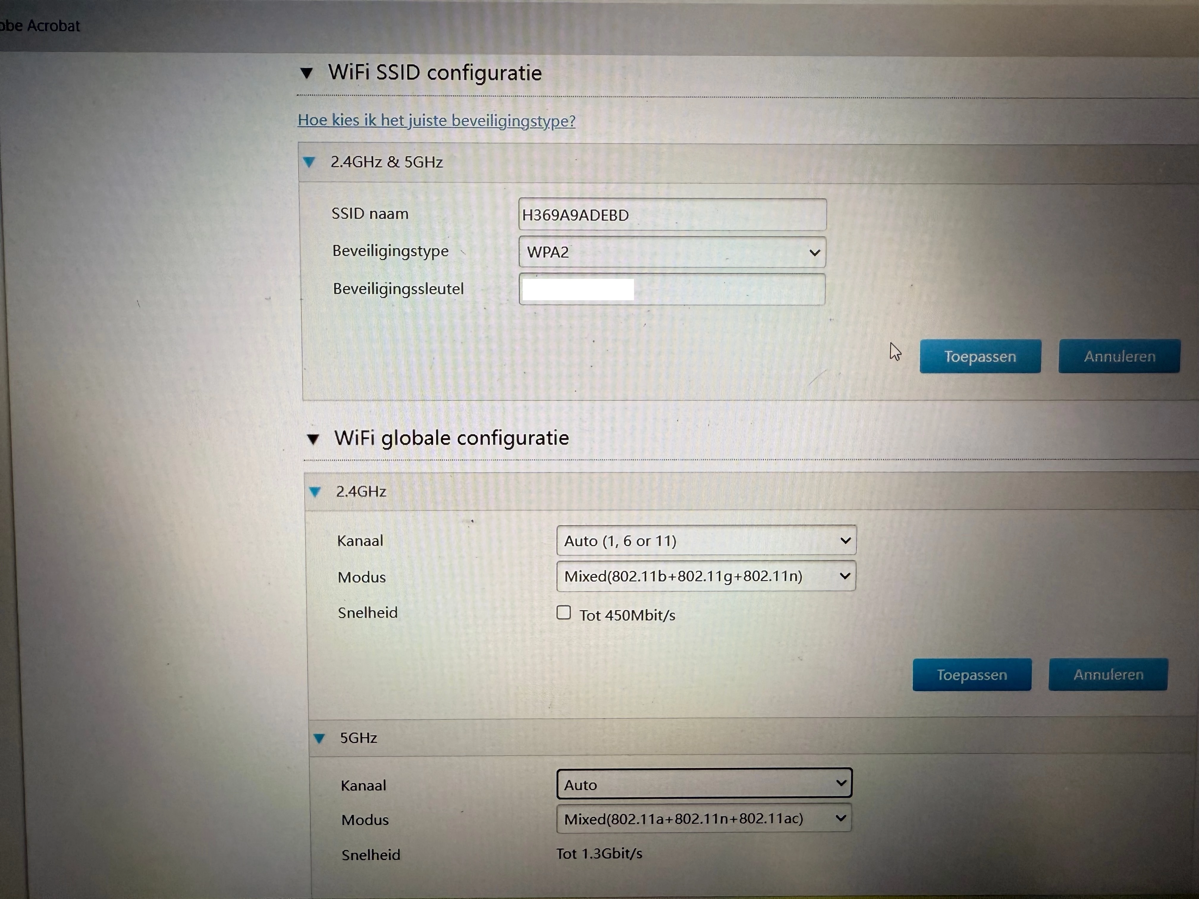 Bedankt voor de foto's ​@John-VG. Dit maakt het wel wat duidelijker hoe je Wifi ingesteld is. Je ziet op de laatste foto dat jouw 2,4 GHz en 5,0 GHz signaal dezelfde naam hebben. Ik zou allereerst even proberen dit te veranderen naar separate namen.