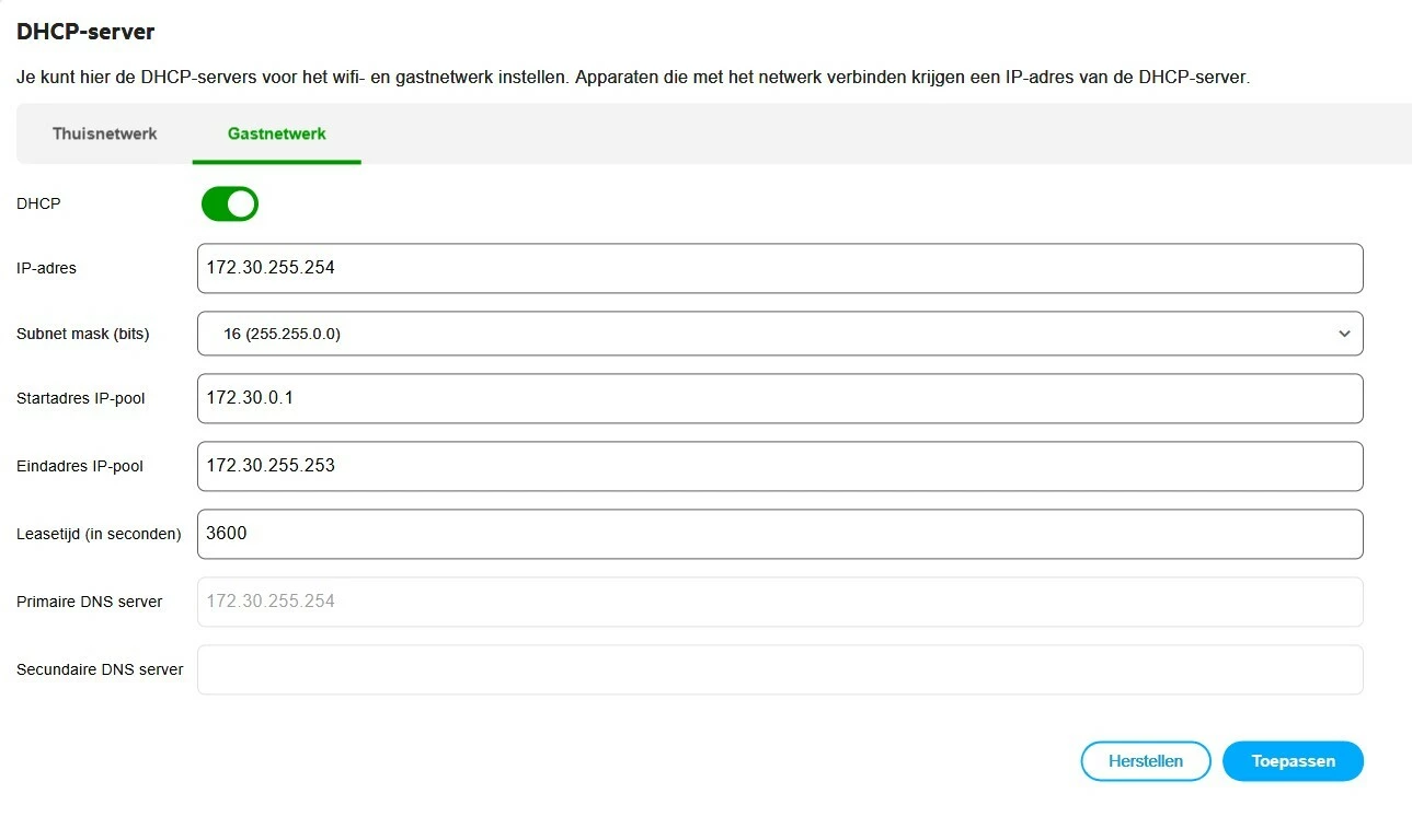 Het enige wat je hier kunt aanpassen is het subnet mask. Die staat bij mij voor gastnetwerk hetzelfde als bij thuisnetwerk. Ik heb wel een box12 en daar is de iprange voor het gastnetwerk heel anders: 192.168.3.xxx