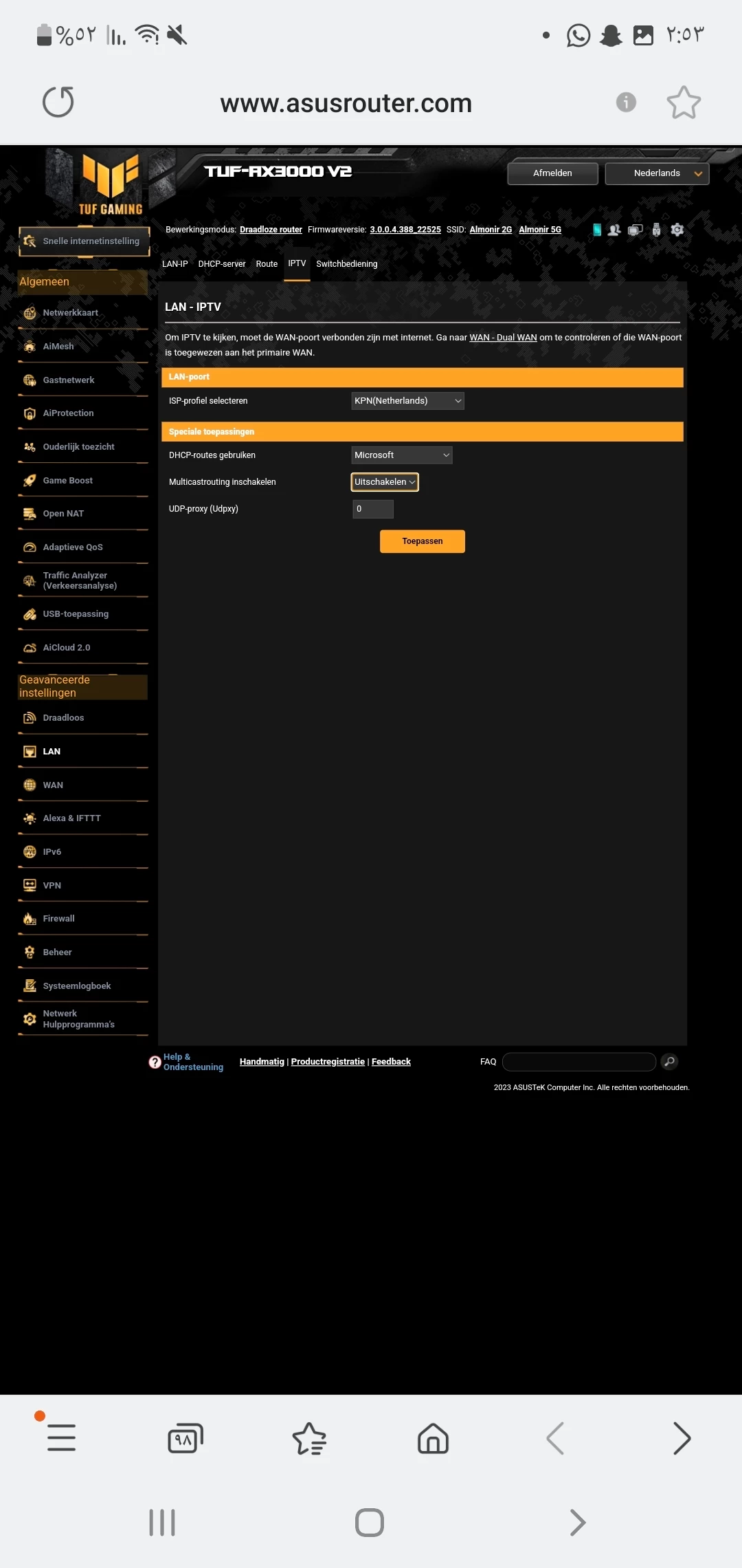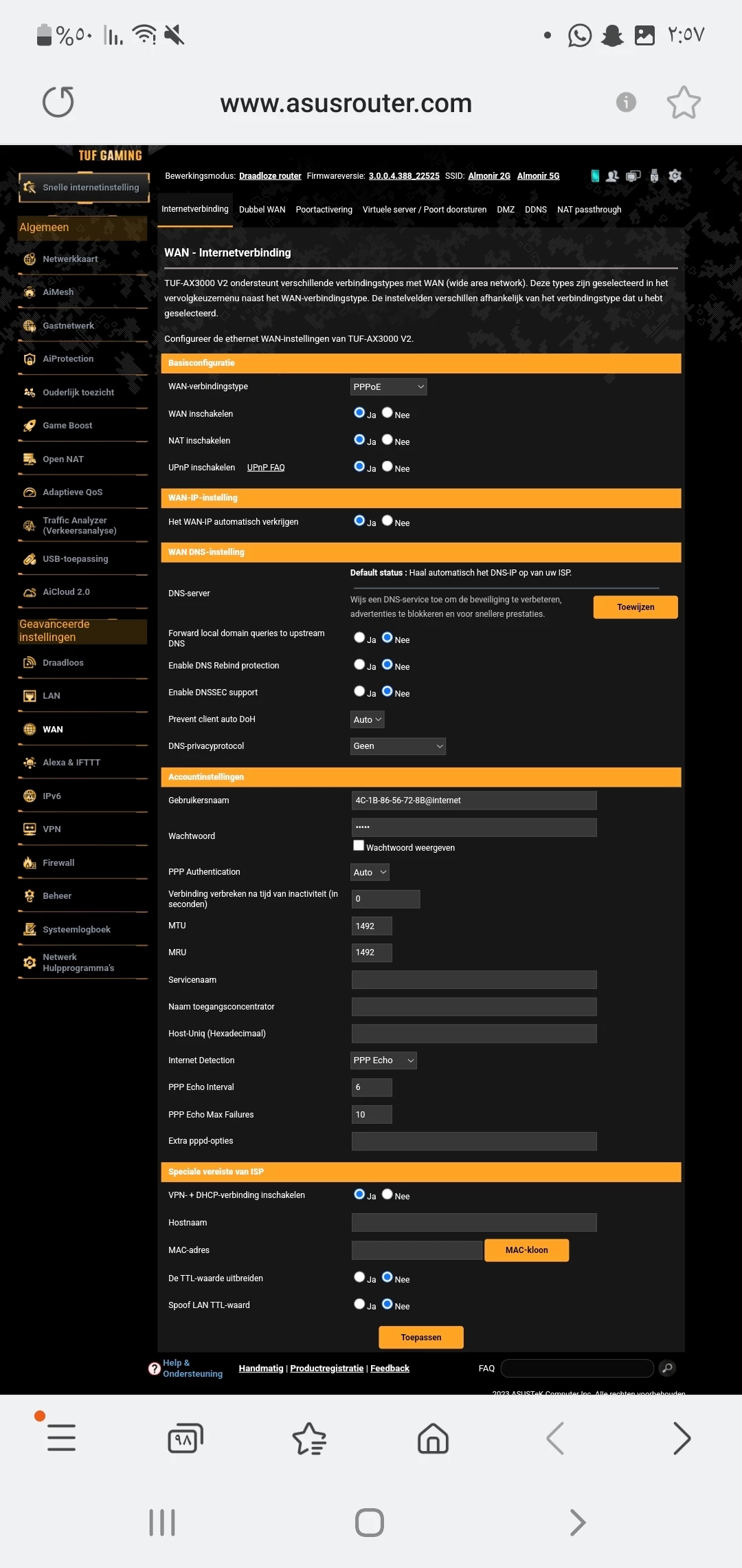 Hoe heb je de nieuwe router aangesloten. Heb je de experiabox er nog tussen zitten of heb je de ASus rechtstreeks op de glasvezel aangesloten