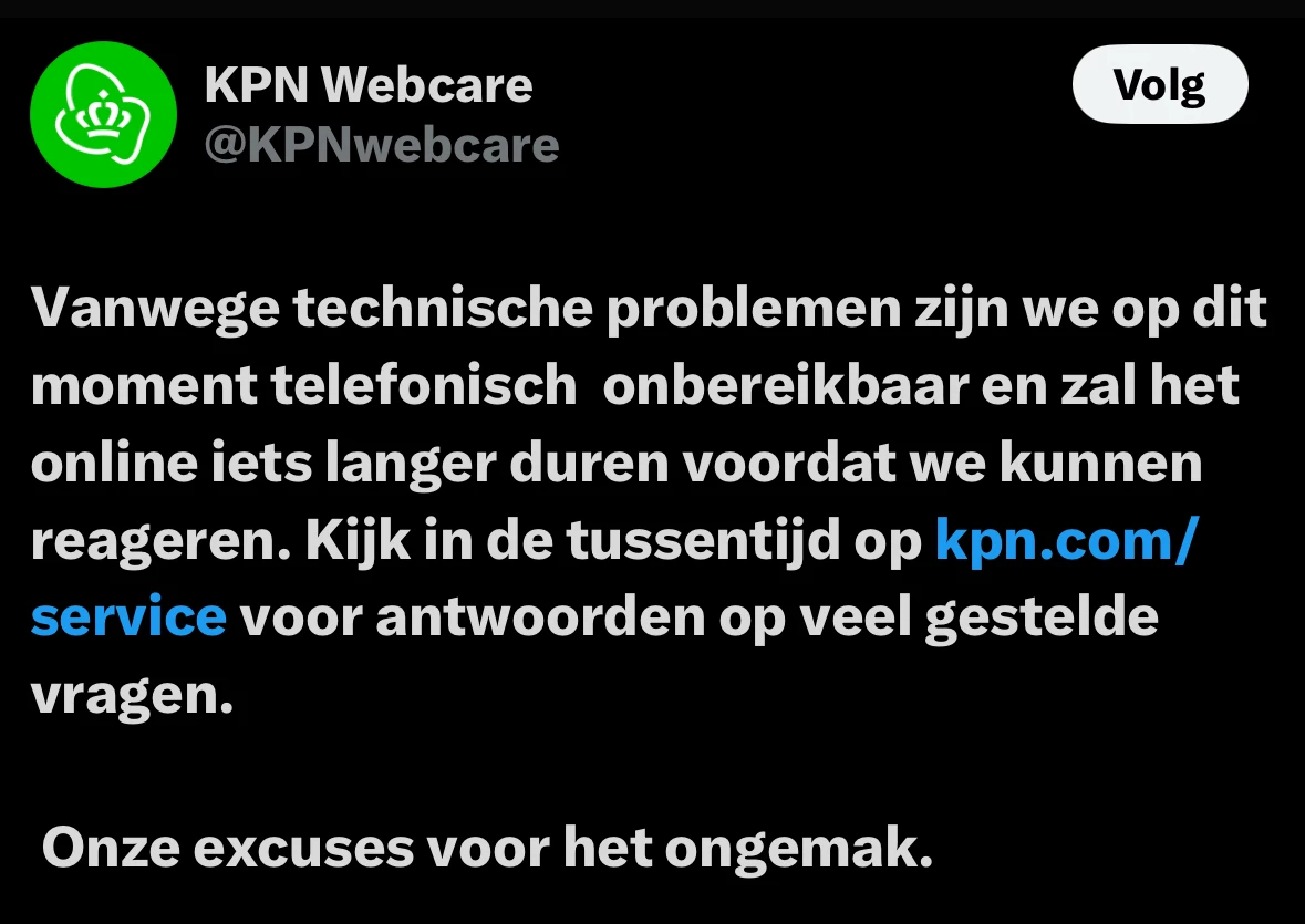 @Suuuus Wat een opstapeling zo… Normaal is KPN rond deze tijd wel bereikbaar, dus ik denk dat er iets mis gaat aan de kant van KPN. Ik zou even een bakje koffie pakken en dan nog een keer bellen. De vraag is alleen wel wat ze telefonisch voor je kunnen betekenen.