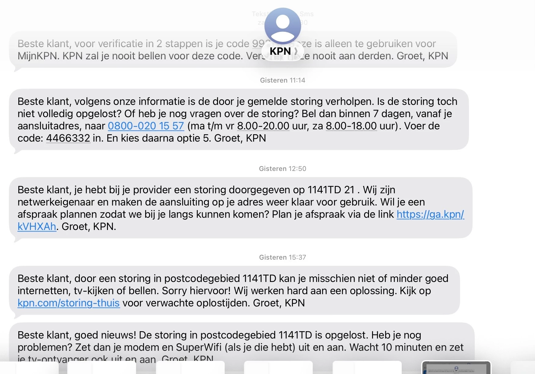 Ik heb een paar keer gebeld maar er is geen enkele update behalve af en toe een blij-makend smsje dat het probleem in ons gebied is opgelost. Hetgeen vervolgens niet het geval is.