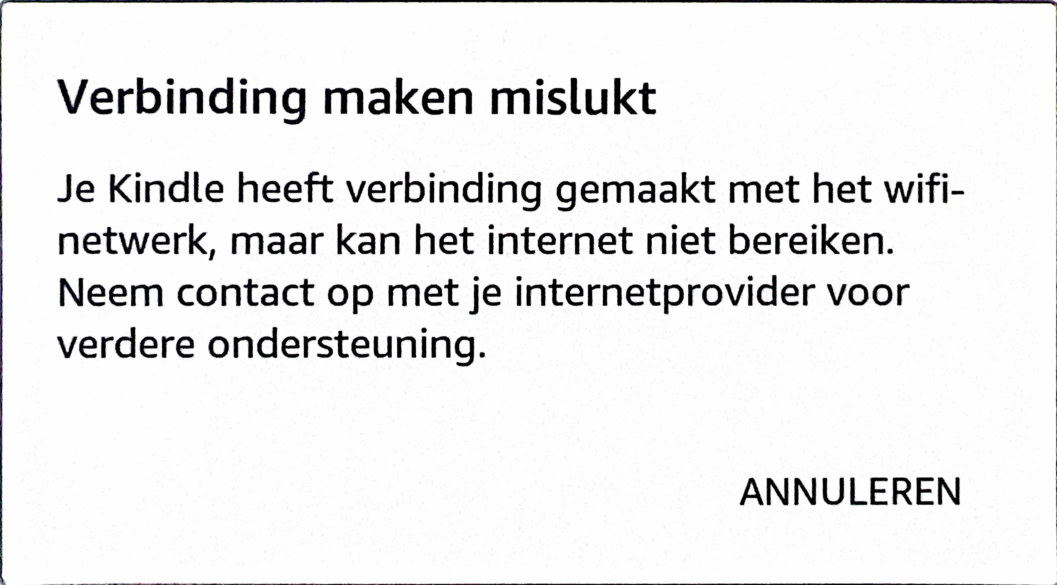 Sinds de update van de Experia Box v10A naar Firmware version V10A.C.25.03.04 kan ik mijn Kindle Oasis niet meer verbinden met het internet. De Kindle maakt wel een verbinding met het wifi-netwerk, maar kan het internet niet bereiken: