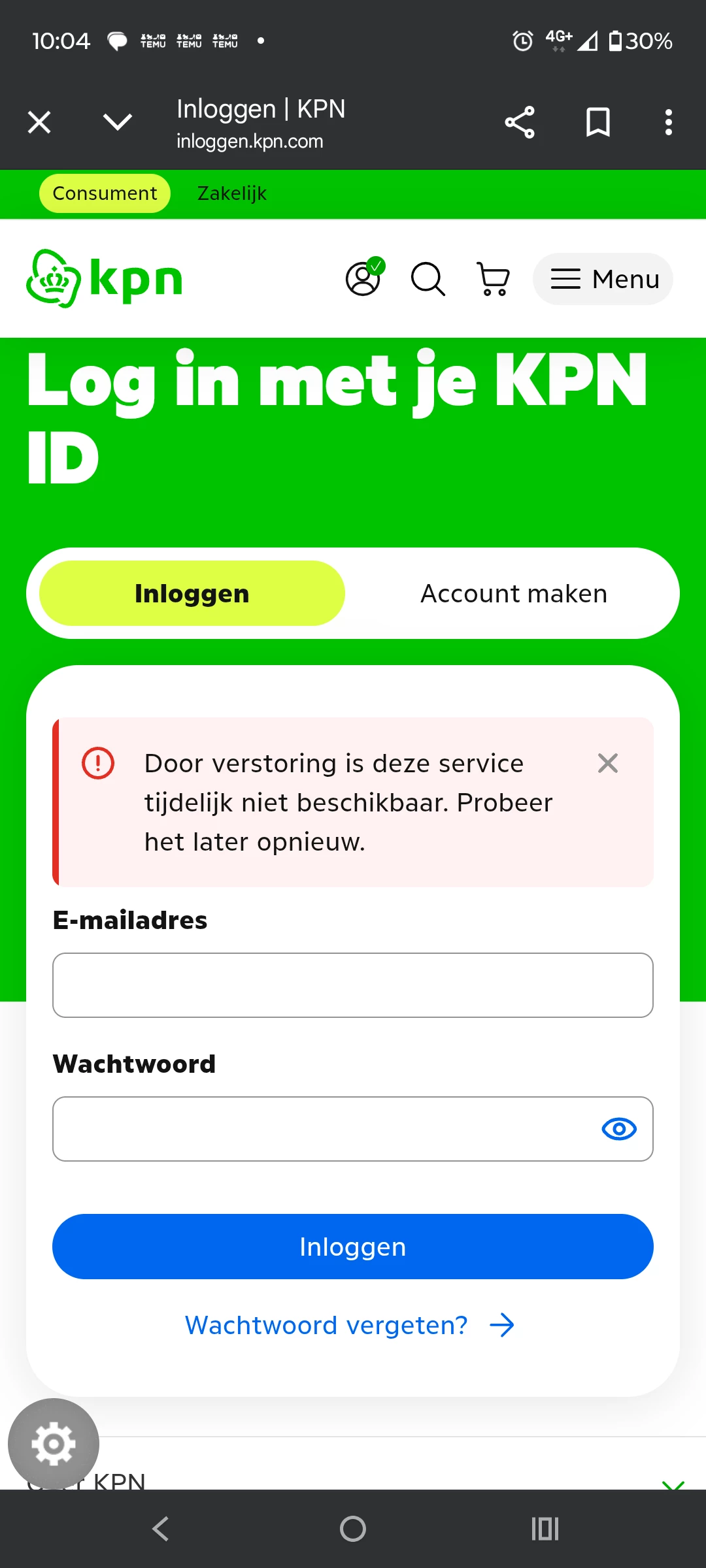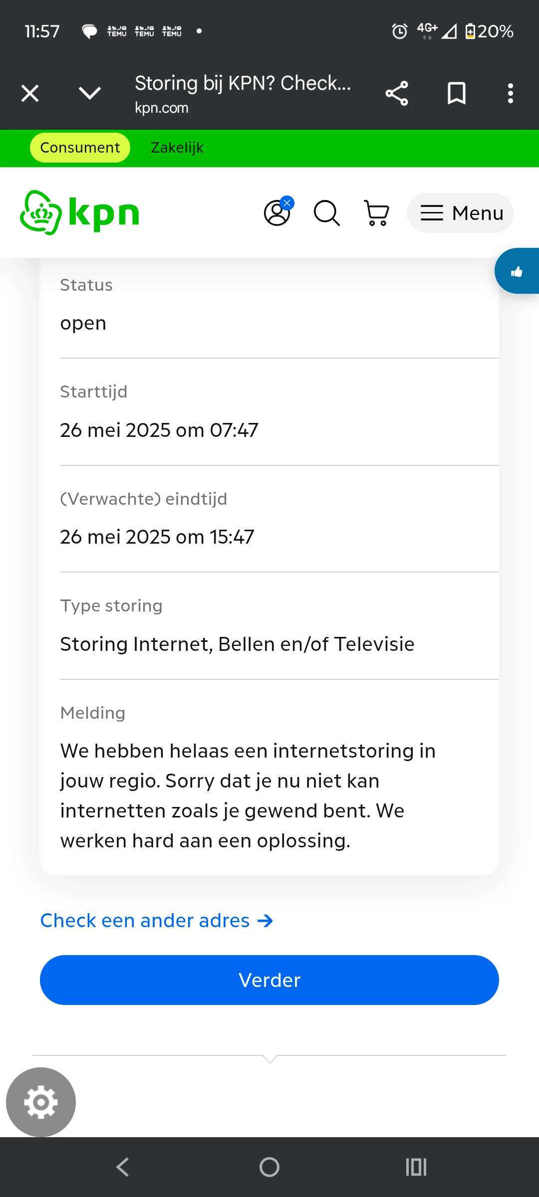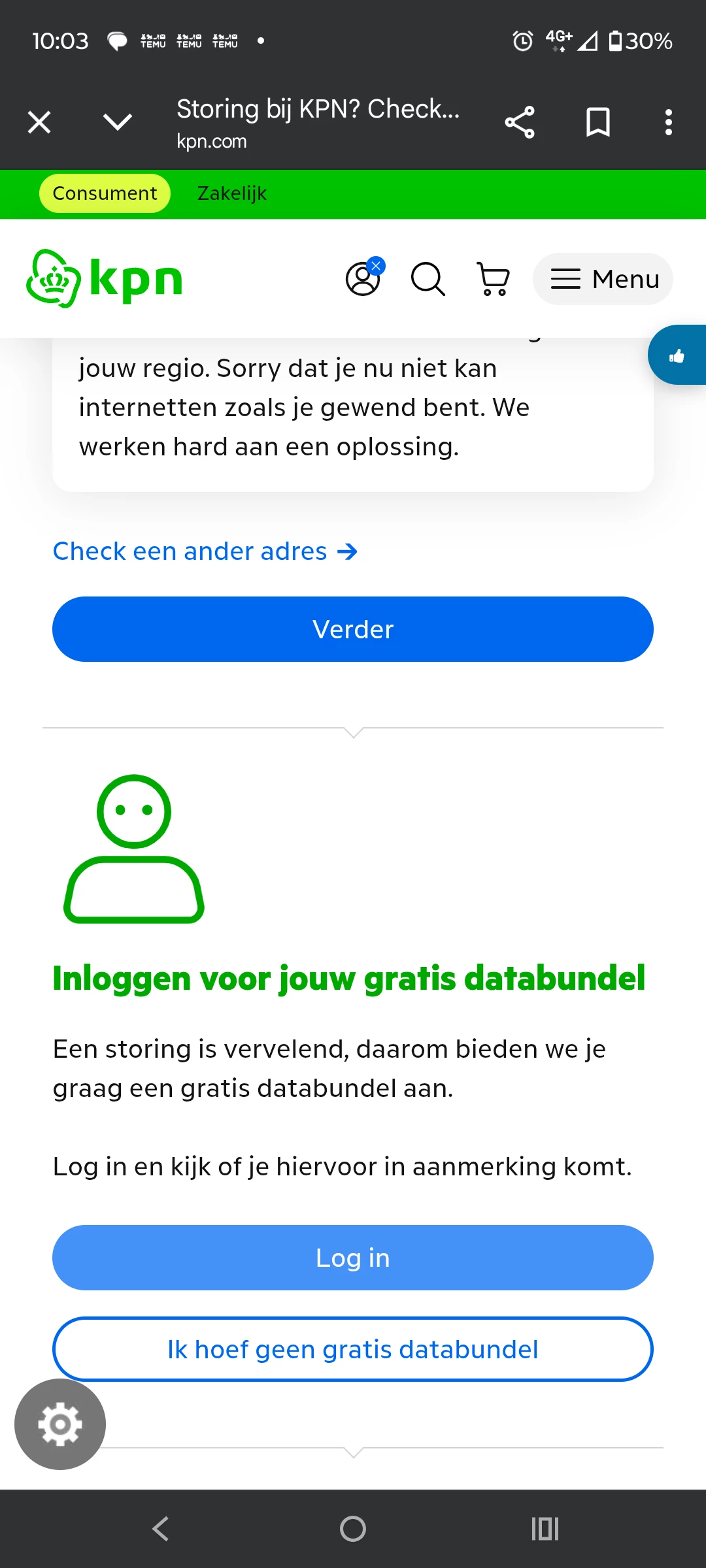 Of wifi van de buren indien die tenminste wel internet hebben, want het ziet eruit als een grotere storing. Anders zou het niet zo op de storingspagina staan.