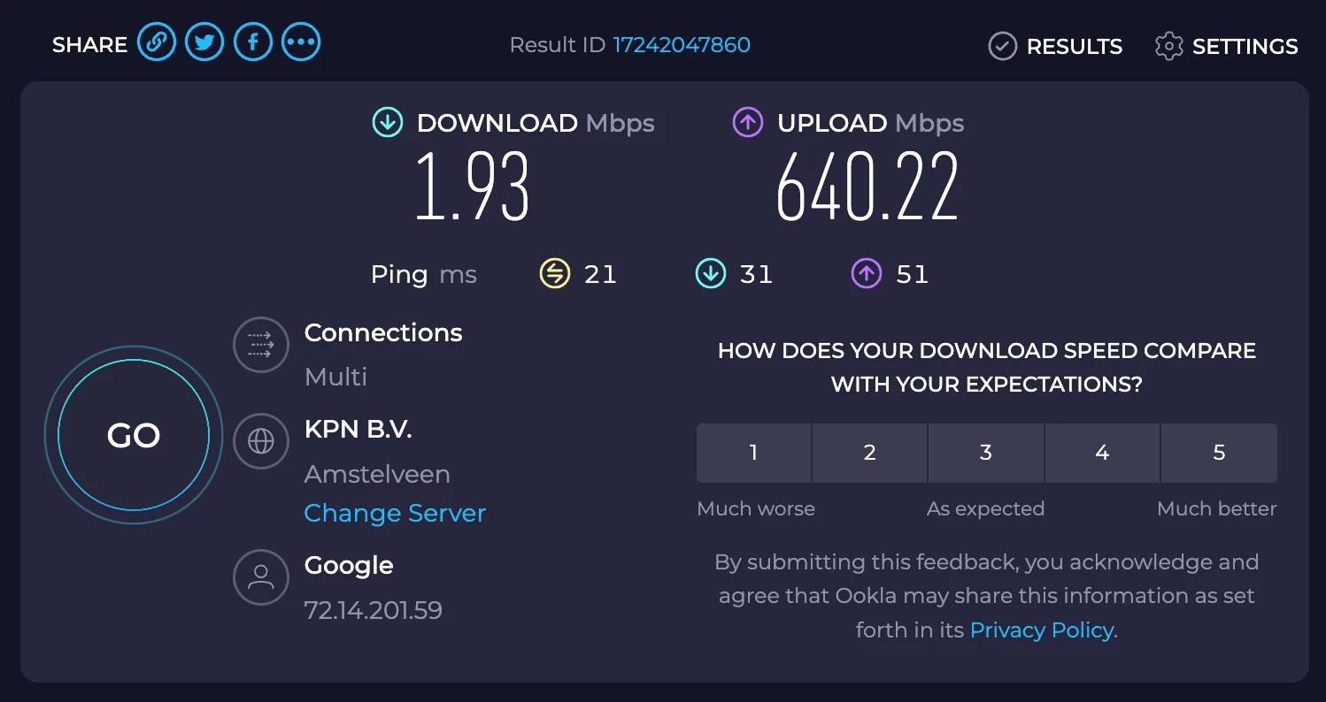 Hoi ​@Yumiboy, welkom op onze community! Dat is wel érg langzaam, al helemaal voor een 1Gb/s abonnement. Ervaar je dit op meerdere apparaten?