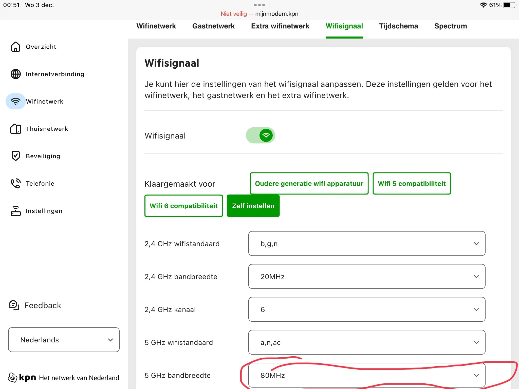 Als je inlogt op het modem kun je bij WiFi signaal de bandbreedte aanpassen.