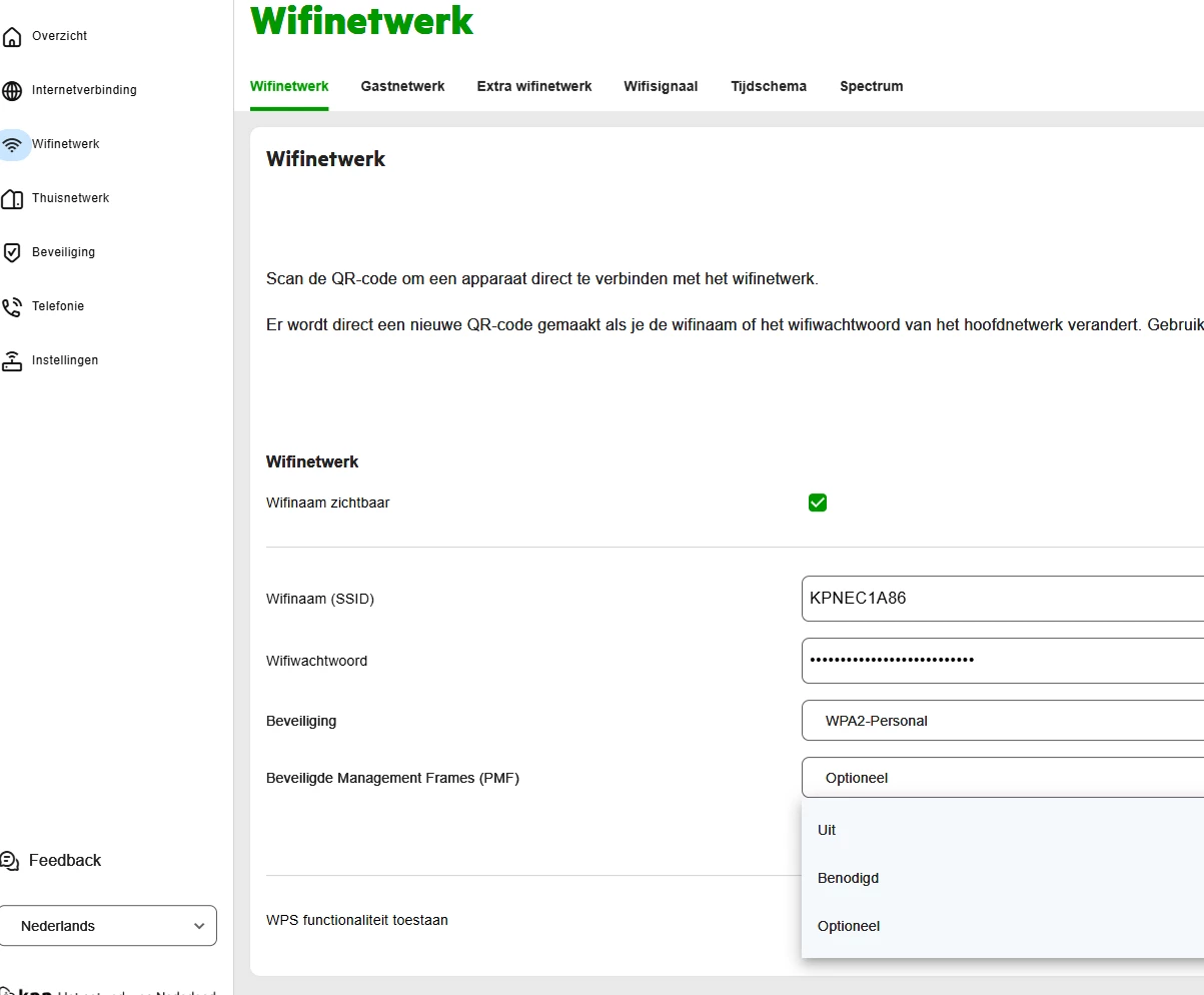 • In de interface van de V10 onder kopje Wifinetwerk, hoe staat daat PMF ingesteld? Zou je dat willen testen op Optioneel of op Uit?