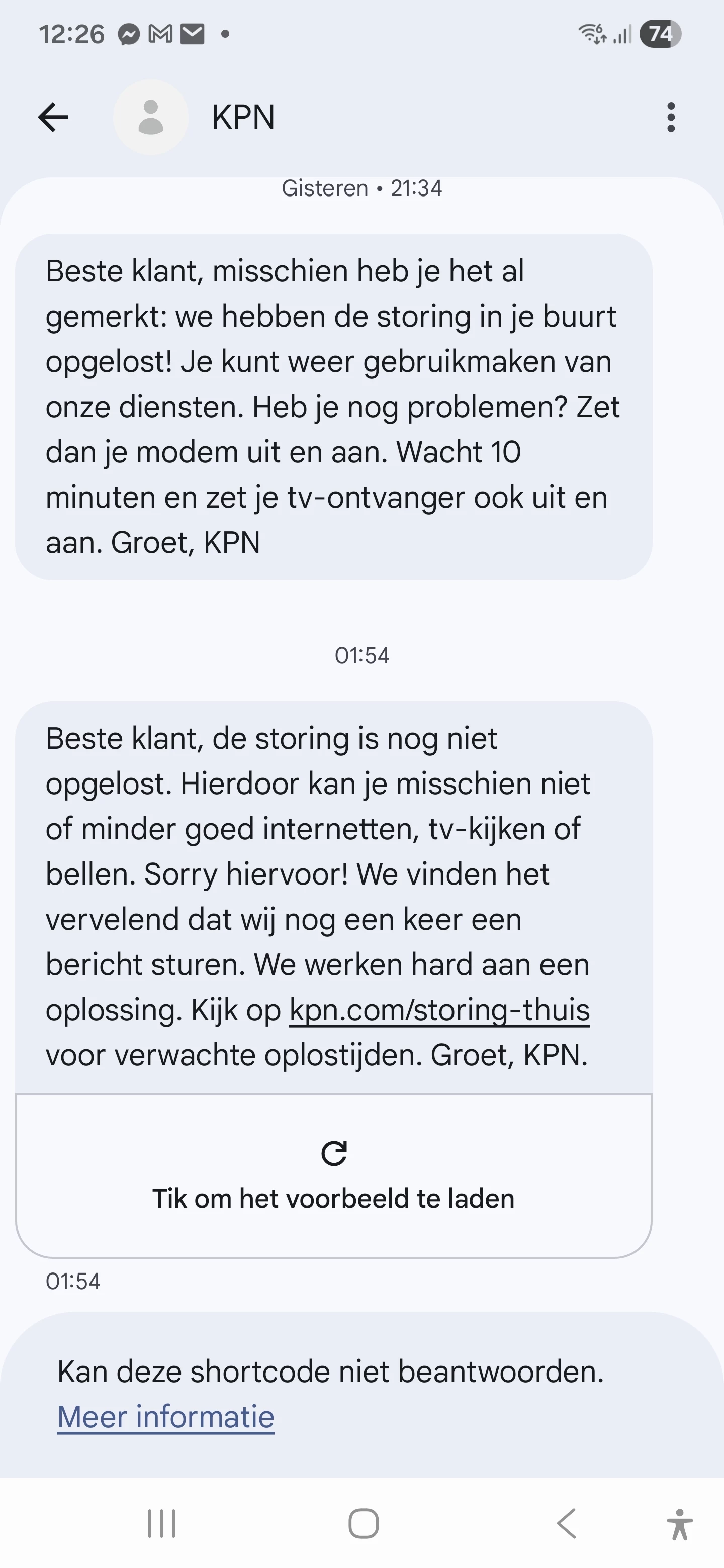 een storing die blijkbaar nog niet is opgelost,,duurt wel erg lang... ben benieuwd