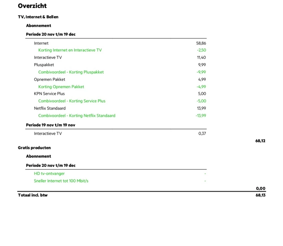 Het enige wat ik je op dit moment kan vertellen is dat je op de specificatie van jouw factuur kunt zien hoe jouw abonnementskosten zijn opgebouwd. De specificatie vind je vanaf pagina 2 van de factuur. De factuur kan je downloaden in MijnKPN.