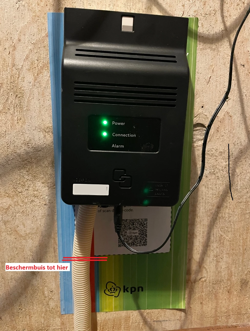 @RBxx, de kabel loopt schuin weg omdat de mensen die de aansluiting hier hebben gerealiseerd heel (on)handig een hardplastic beschermings buis eromheen hebben geplaatst (zie foto). Dit bemoeilijkte het plaatsen van de ONT aanzienlijk en er kwam daardoor heel veel spanning op de kabel. Ik heb nu nog geen actieve aansluiting maar gelukkig inmiddels wel 2 groene lampjes.