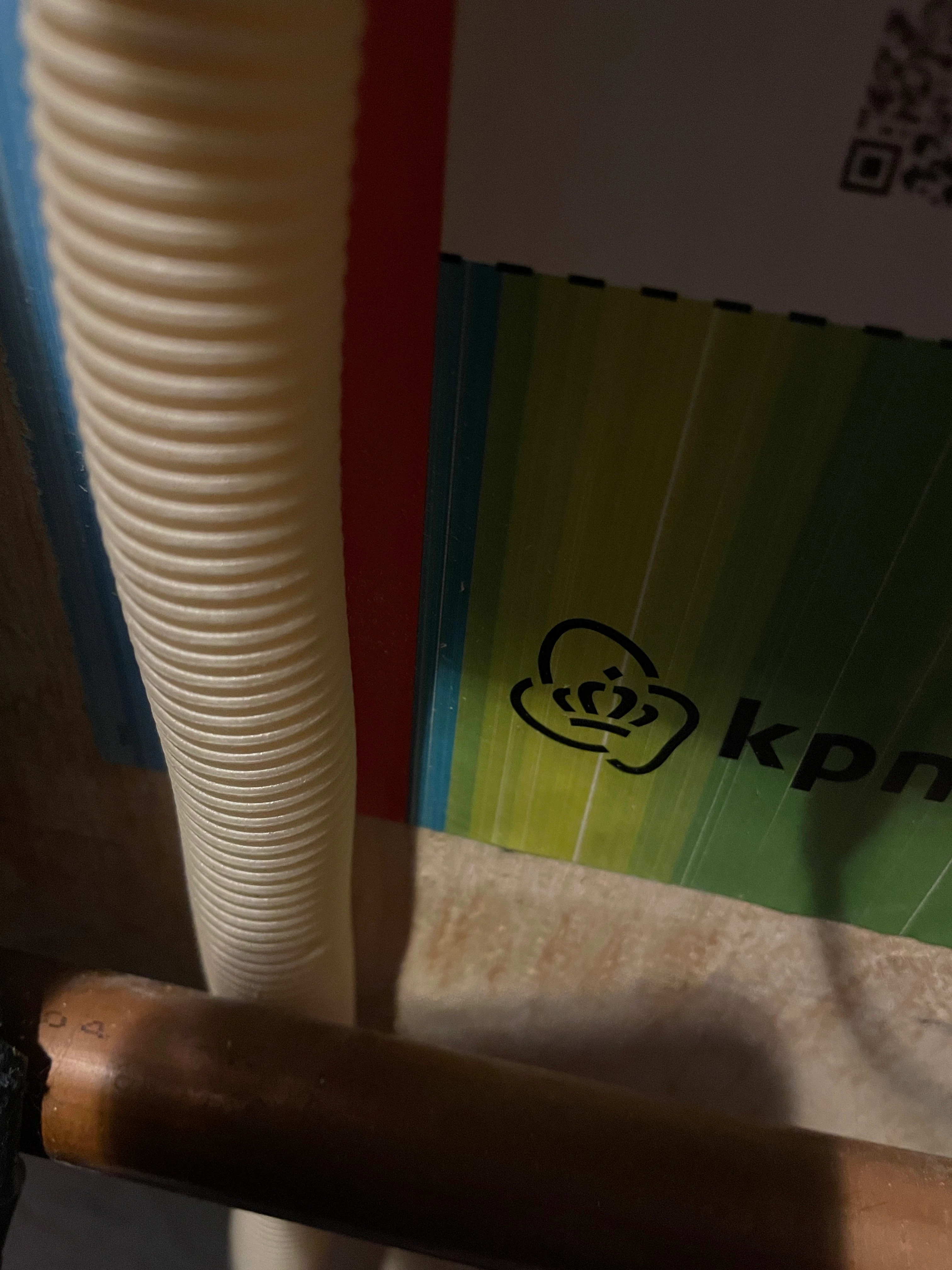 Waarom loopt de oranje glasvezel schuin weg ​@Koenson ? Die hoort recht naar beneden te lopen, zoals afgebeeld op de achtergrond sticker. Zo schuin zit de kabel mogelijk in de weg bij het vlak langs de muur omhoog schuiven van de ONT (glasvezelkastje).