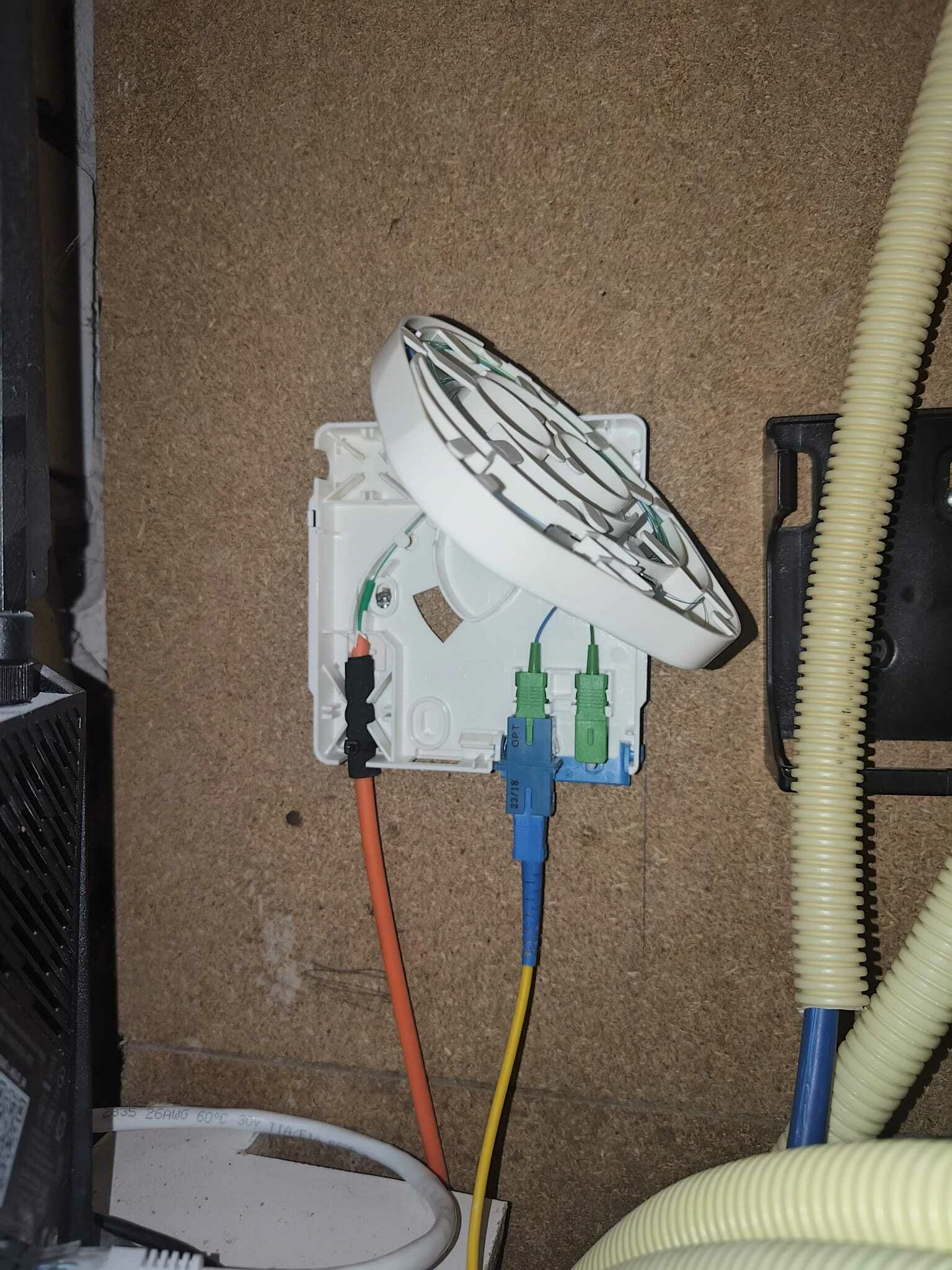 Toen ik Odido had heb ik mijn glasvezel verbinding laten verplaatsen naar mijn meterkast. Daar is het kastje geplaatst zoals je kunt zien in de foto (kapje eraf voor duidelijkheid), met de glasvezel connectors bij het blauwe klepje. Ik gebruikte destijds een media converter om dit aan te sluiten op mijn router.