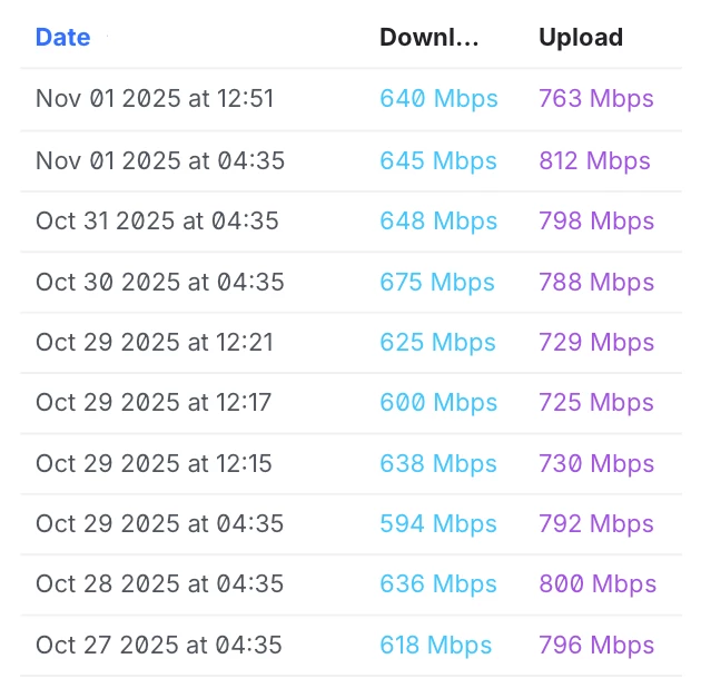 Ik heb het abonoment van KPN met 1gbps up/down-load. Na verschillende tests doorlopend over de weken zie ik iets opvallends. Mijn download is vaak rond de 600.