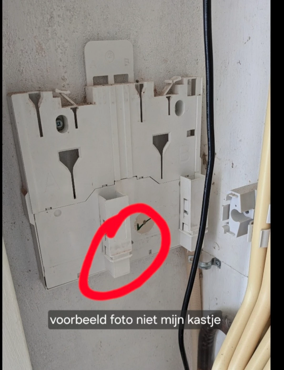 Ik ben net verhuisd en heb het huidige glasvezel kastje eraf gehaald (vd kpn) omdat ik dacht dat ik mijne hierop aan moest sluiten. Maar ik kwam er achter dat ik een andere aansluiting heb. Nu krijg ik het oude kastje er niet meer op omdat het onderste gedeelte uitsteekt( zie foto) is er een trucje hoe ik dit weer omhoog krijg of hoe ik hem er überhaupt weer op moet doen