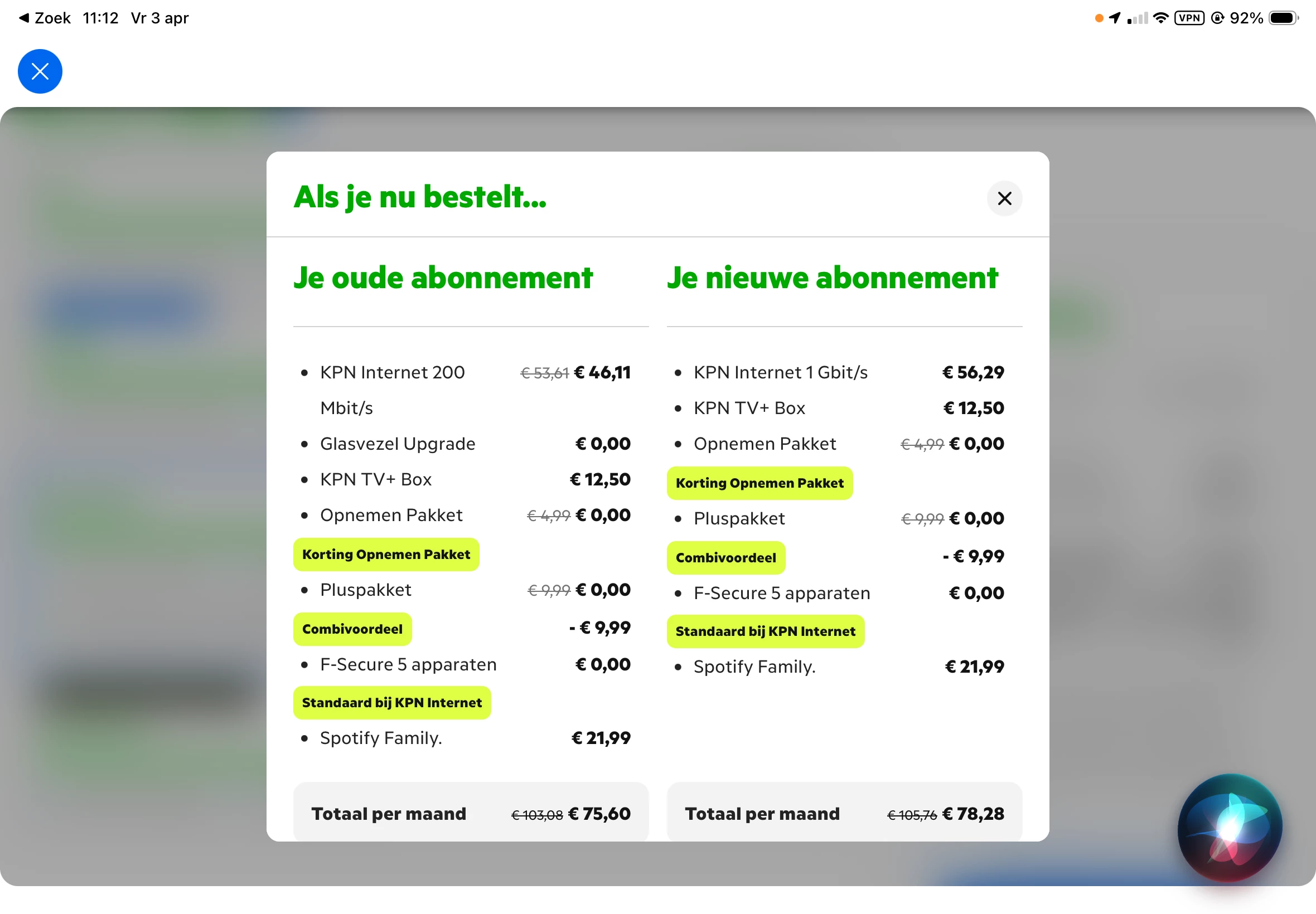 Maar ik kan wel vinden waar het verschil in eindprijs vandaan komt. Dat komt volledig door de verandering van het internet. Je gaat in dit plaatje van 53,61 naar 56,29. Een verschil van 2,68.