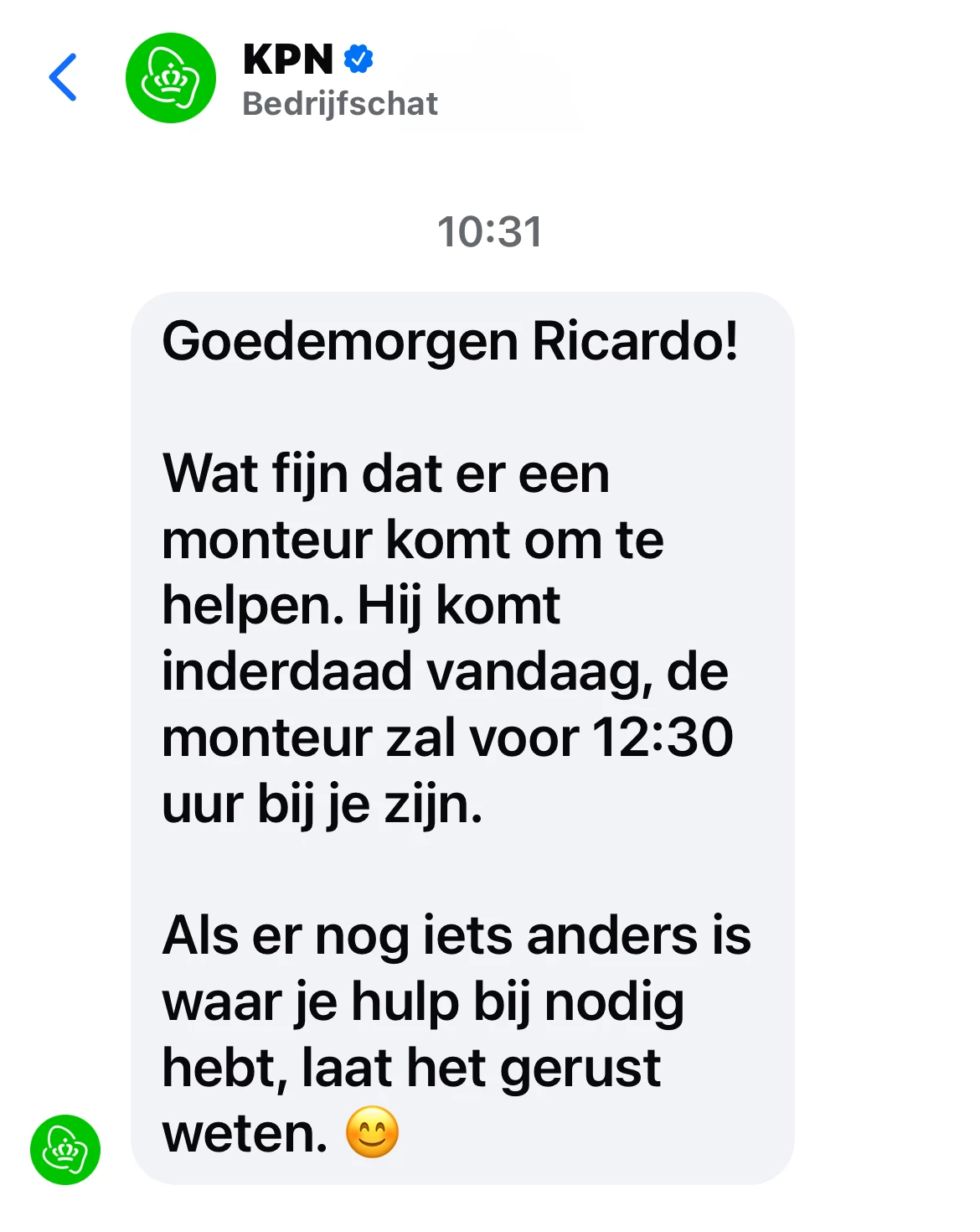 “Het is volstrekt onacceptabel en onbehoorlijk hoe wij vandaag door KPN zijn behandeld: ondanks herhaalde toezeggingen dat de monteur vandaag zou komen – waarvoor wij sinds 08:00 uur thuis klaarzitten en zelfs extra hulp hebben ingeschakeld vanwege de progressieve spierziekte van mijn vrouw – worden wij nu, na uren wachten en tegenstrijdige informatie, simpelweg afgebeld met de mededeling dat het pas volgende week wordt geregeld. Dit is niet alleen klantonvriendelijk, maar getuigt van een schrijnend gebrek aan respect voor gemaakte afspraken en persoonlijke omstandigheden.”