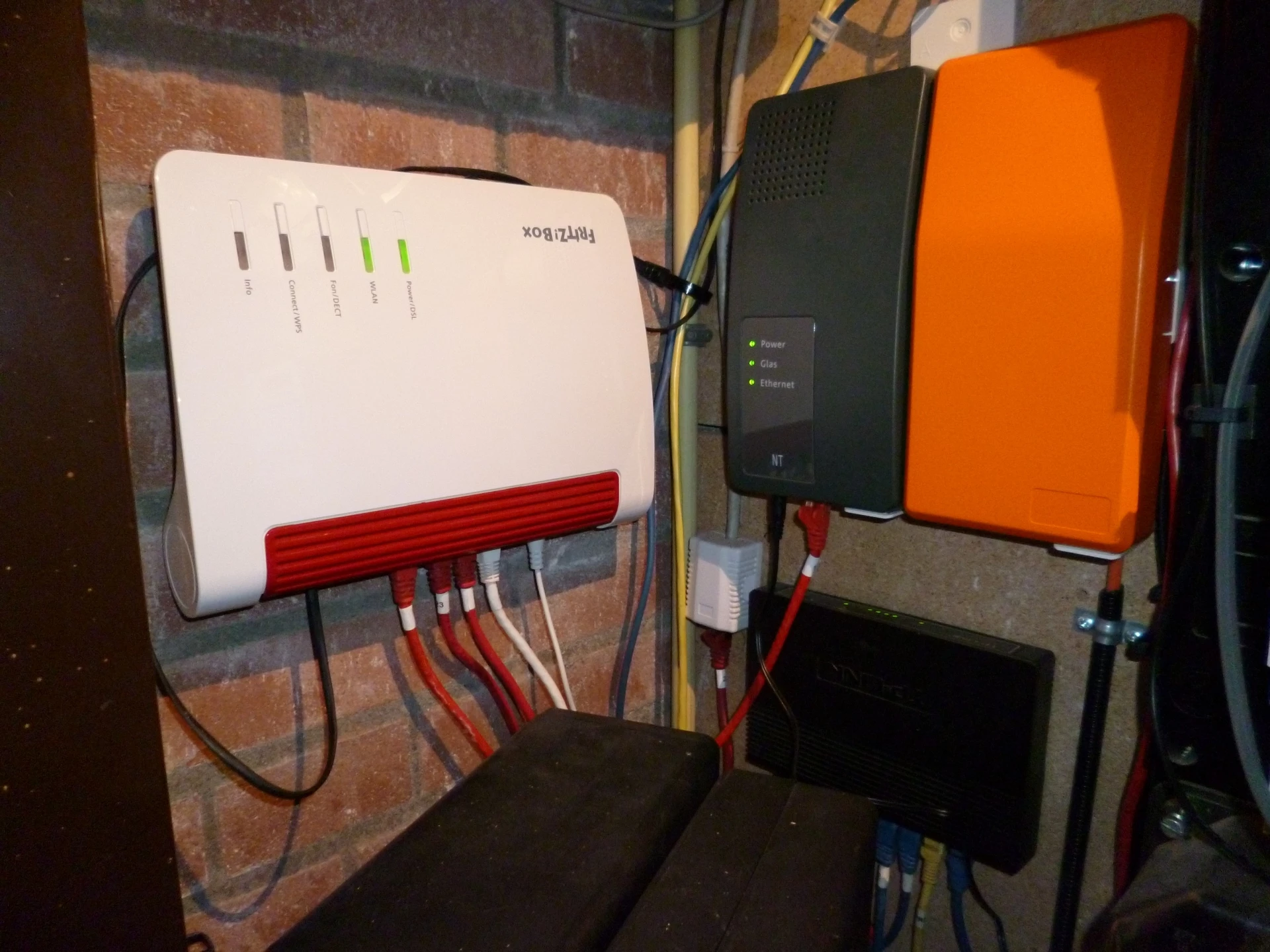 Hier staat de Fritzbox heel eenzaam gezellig in het tv meubel, nadeel als je glasvezel in de woonkamer je huis binnenkomt.  Hij staat hier volledig vrij, dus maximaal wifi signaal. In de la eronder zitten ook nog diverse netwerkschijven en een simkaart dongel die automatisch ingeschakeld wordt als het glasvezelnetwerk wegvalt (dat gebeurd hier nog wel eens maandelijks in de nacht). Met een slim huis heb je dan wel altijd verbinding nodig.