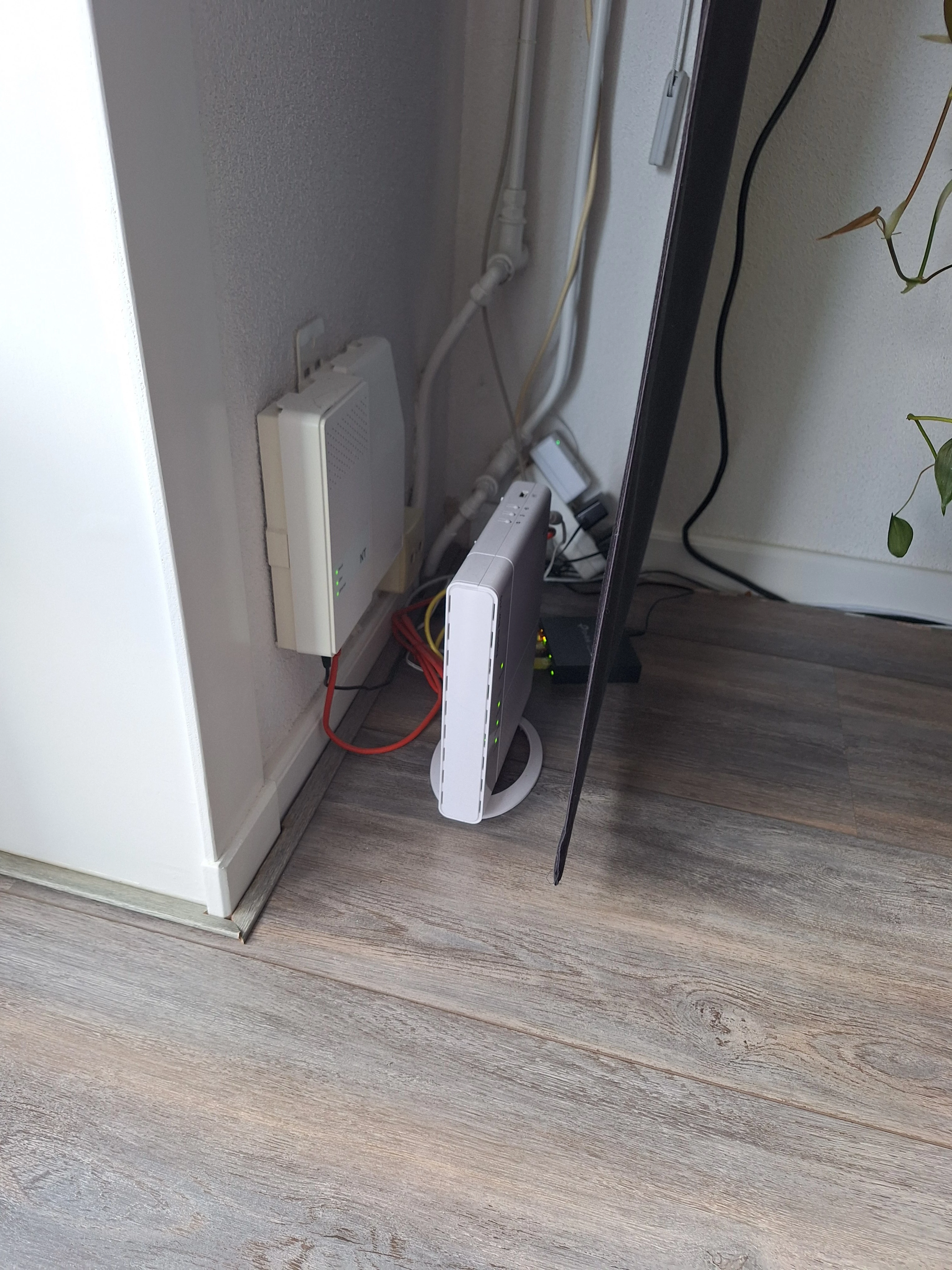 Onze V10 in de woonkamer, daar waar de glasvezel binnenkomt. En dus ook het 'glasvezelkastje' hangt. En enigzins verdekt opgesteld achter het gordijn 😀 Ben persoonlijk wel blij dat mijn glasvezel niet in de meterkast binnenkomt, want een slechtere plek dan dat kan je niet verzinnen.