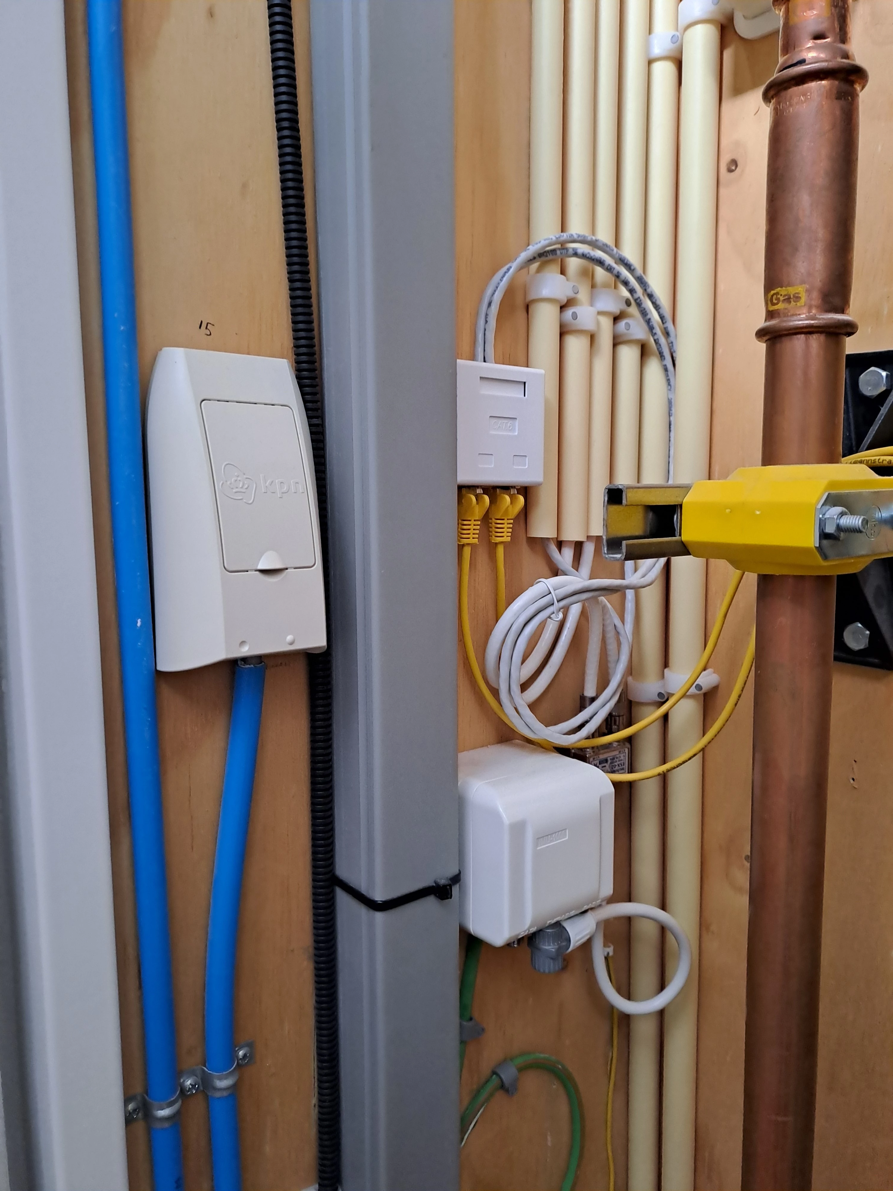 Ik heb het geluk met mooie meterkast in gerenoveerd schoolpand, al moest er wel een plankje in om het modem op te kunnen hangen; al die pijpen hangen stevig in de weg. Blijkbaar monteren ze nog steeds varkenssnuitjes in de muur, met cat5e naar de meterkast. Ik had telefoonaansluiting in twee kamers. Deze heb ik vervangen voor ethernet aansluiting en in de meterkast netjes afgemonteerd.
