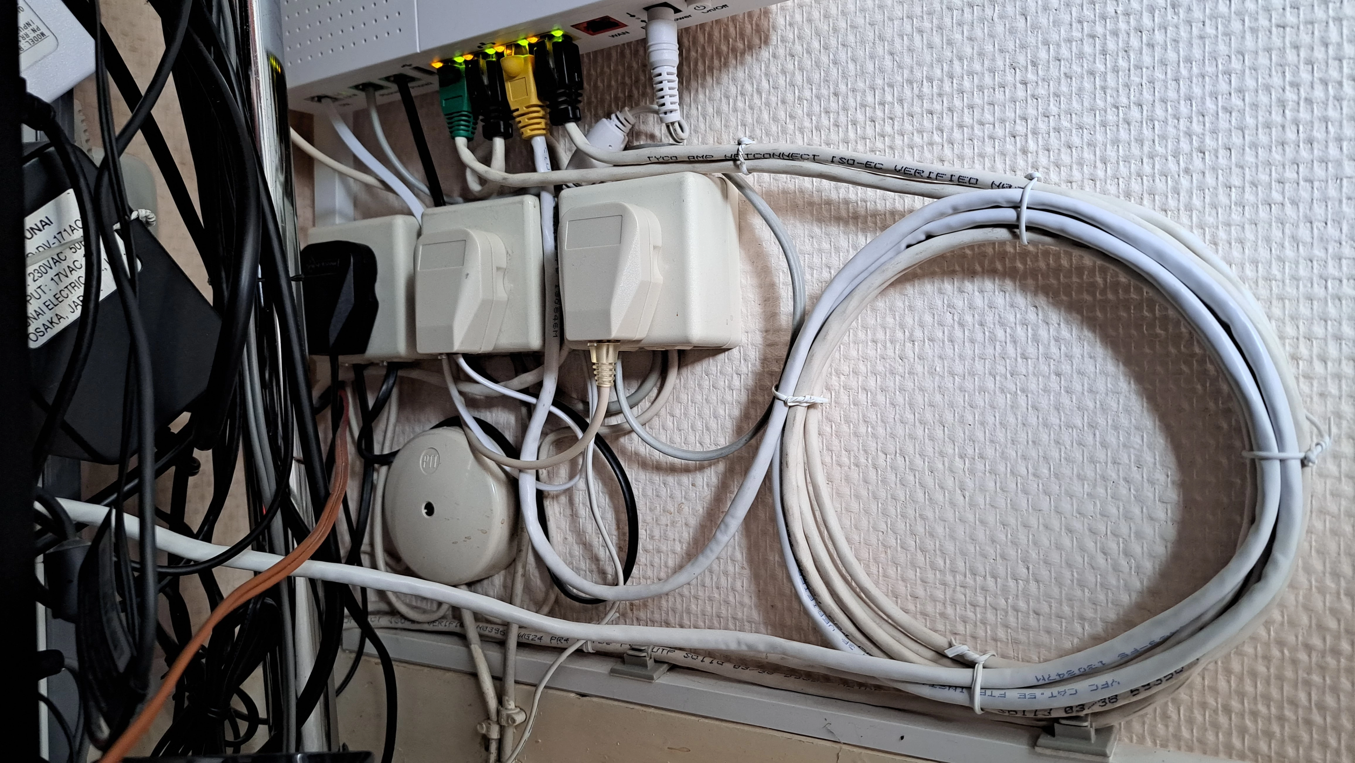Hier hangt de V10 aan de muur in een hoek van de woonkamer naast de desktop computer die op de vloer staat onder het bureau. Dus alles uit het zicht. Koperaansluiting komt binnen met IS/RA punt in een voorraadkast en vandaar een kabel naar het modem. Alleen internet en vaste telefoon, TV van KPN is hier in Rotterdam niet mogelijk vanwege amper 4 Mbps down.