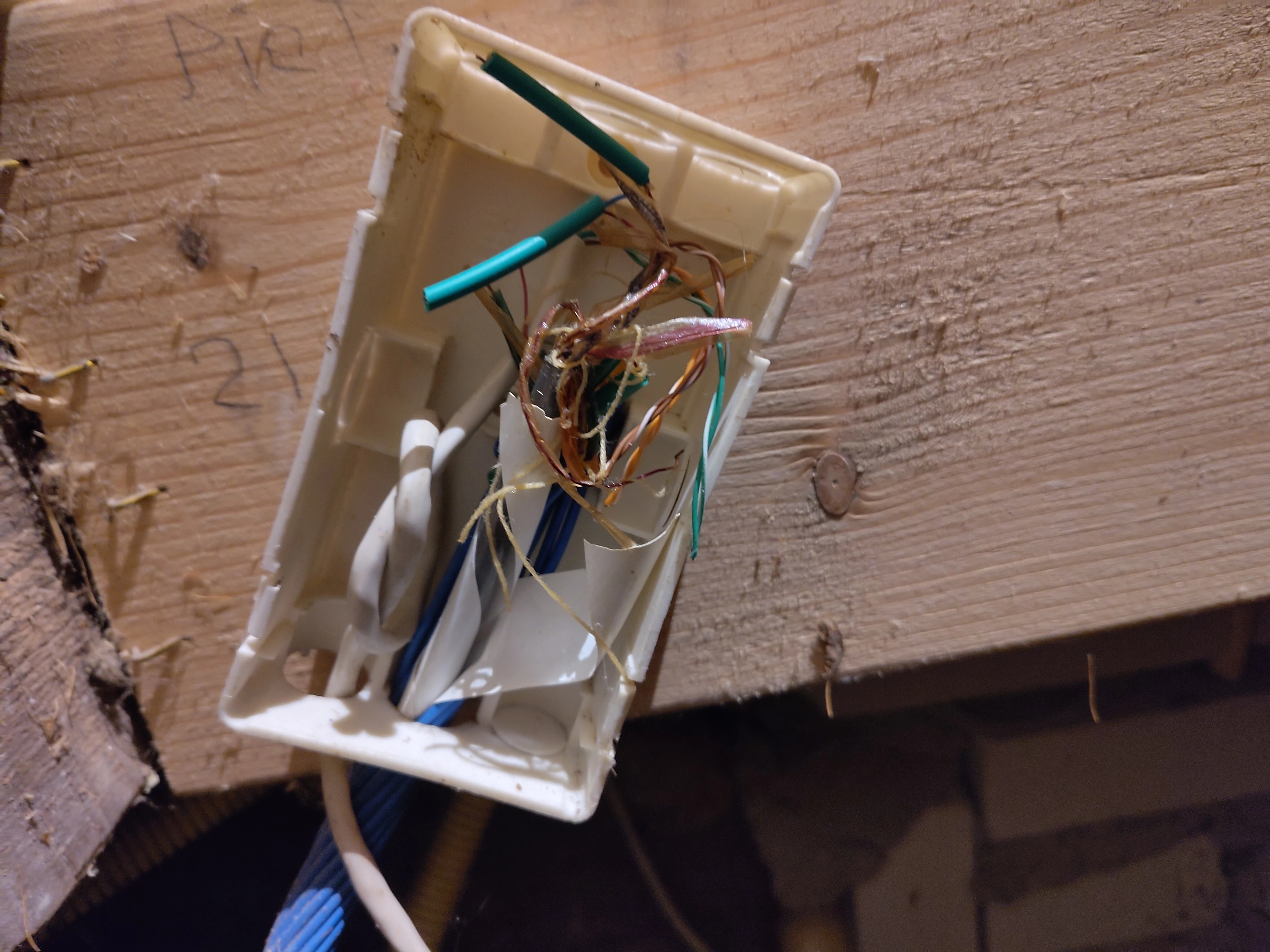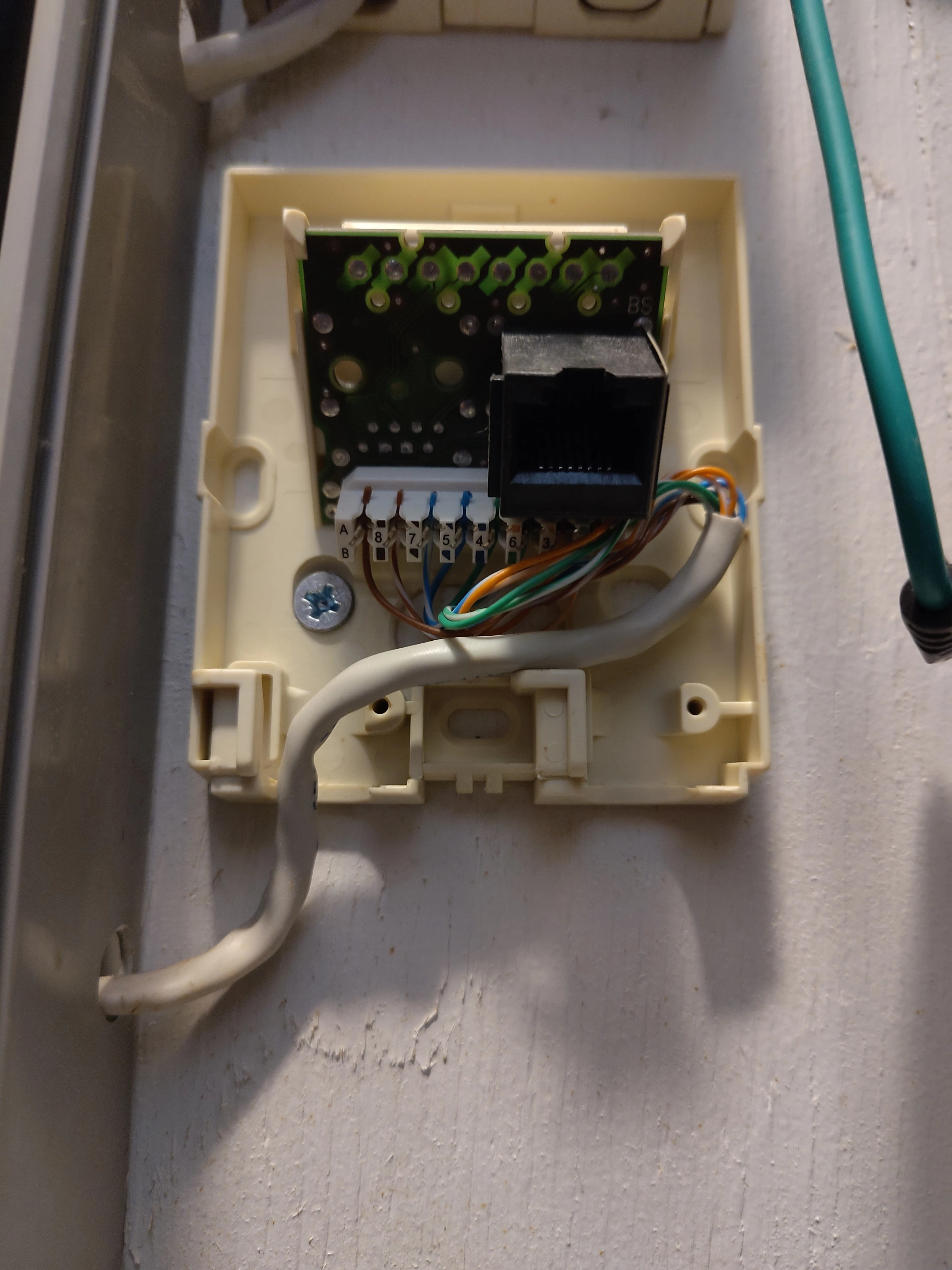 Ik ben een recente overstapper van Odido, maar aangezien KPN niet opschiet met het glasnetwerk heb ik helaas vandaag moeten uitzoeken waar mijn koper-aansluiting verstopt zat. Het blijkt dat de vorige eigenaar daar een bijzonder kunstwerkje van had gemaakt, zie foto. Er bestaat hier blijkbaar geen ISRA-doos, maar onder de voordeur is dit doosje geklust, waarin de aders naar een CAT5 kabel zijn gevlochten, die dan in de meterkast uitkomt. Ik dacht dat ik het modem gewoon daar in zou kunnen prikken, maar die Y-kabel heeft twee poorten nodig, en ik kan helaas niet vinden welke kleur naar welke pin zou moeten gaan. Ik heb geen 4-pins DSL kabel in huis, dus ik kan niet testen of het al in de volgorde is aangesloten die dat modem verwacht. Dan dus toch maar dat twee-poorts kastje ertussen hangen - ik kan ze bij de pinnen van het bestaande meterkastdoosje prikken, maar ik moet dus even uitvissen welke kleur waar terecht komt. Weet iemand welke kleur van de blauwe kabel in welke terminal van een klassieke ISRA-doos hoort? Of nog beter: staan er specifieke voltages of weerstanden tussen specifieke lijnen die ik zou kunnen meten om erachter te komen wat wat is?