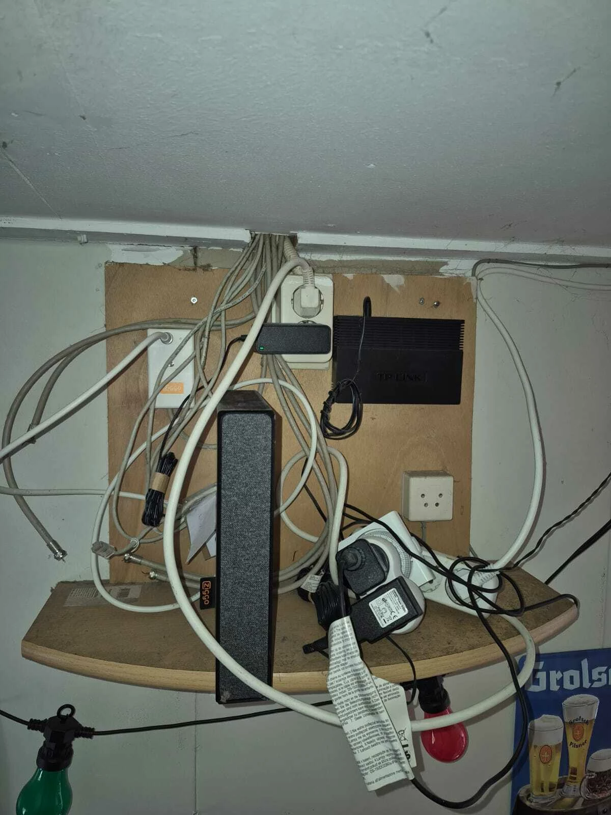 Kan het zijn dat de gasleiding onder het huis via de kruipruimte naar binnen komt? Daar hebben we namelijk wel een meter voor druk o.i.d. Oude telefoonaansluiting staat denk ik naast de huidige router. (zie foto) Er gaan ook een heleboel kabels het plafond in, maar ik denk dat die naar de verschillende Ethernet poorten rondom het huis gaan?