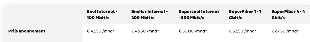 Het verschil in prijs tussen 100Mbit en 1Gbit is €10 voor 10x zo snelle verbinding.
