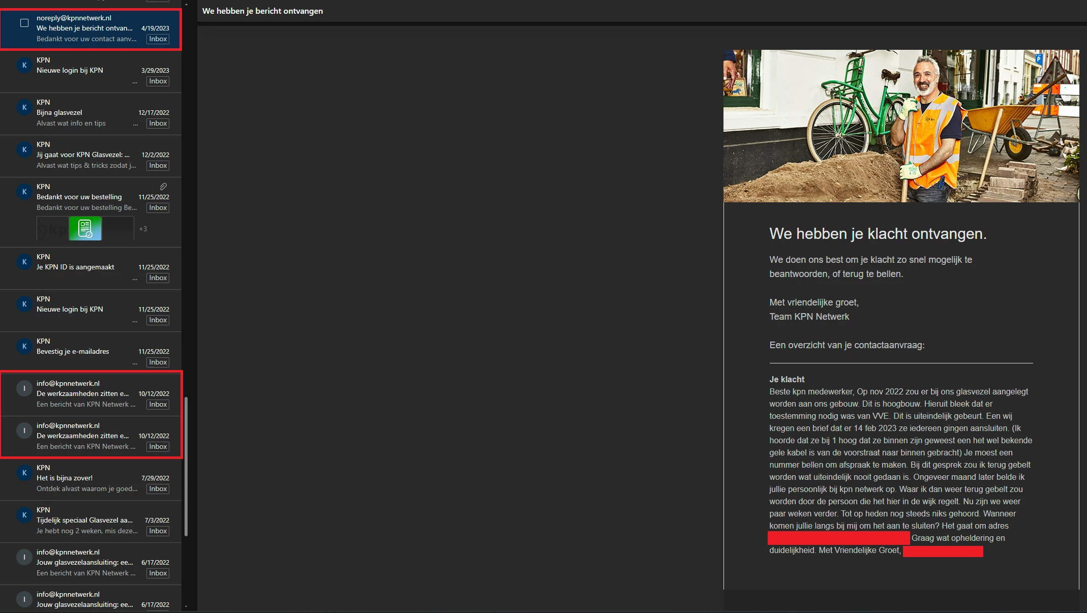 KPN is mijn contractpartij, en ik verwacht daarom dat hun actief blijven monitoren en druk blijven uitoefenen op KPN Netwerk en de aannemer. Enkel doorverwijzen of afwachten is in deze situatie niet acceptabel meer, omdat dit in de praktijk alleen maar tot nóg meer vertraging leidt.
