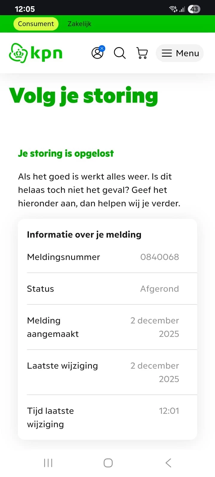 Ik heb net een smsje ontvangen dat het opgepakt wordt. Maar vervolgens is er ook een link in de sms om je klacht/storing te volgen. Daar staat dan vervolgens dat de klacht is afgerond? Begint al goed!