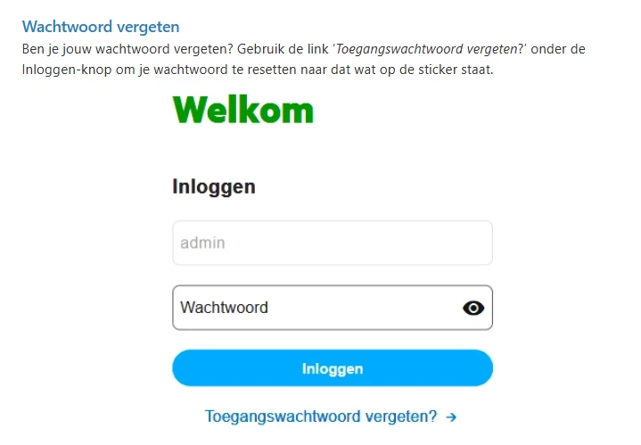 Bij de V10 hoef je niet de modem te resetten. Dan kun je op de inlogpagina op Toeganswachtwoord vergeten klikken en die instructies volgen. Het ziet er zo uit: