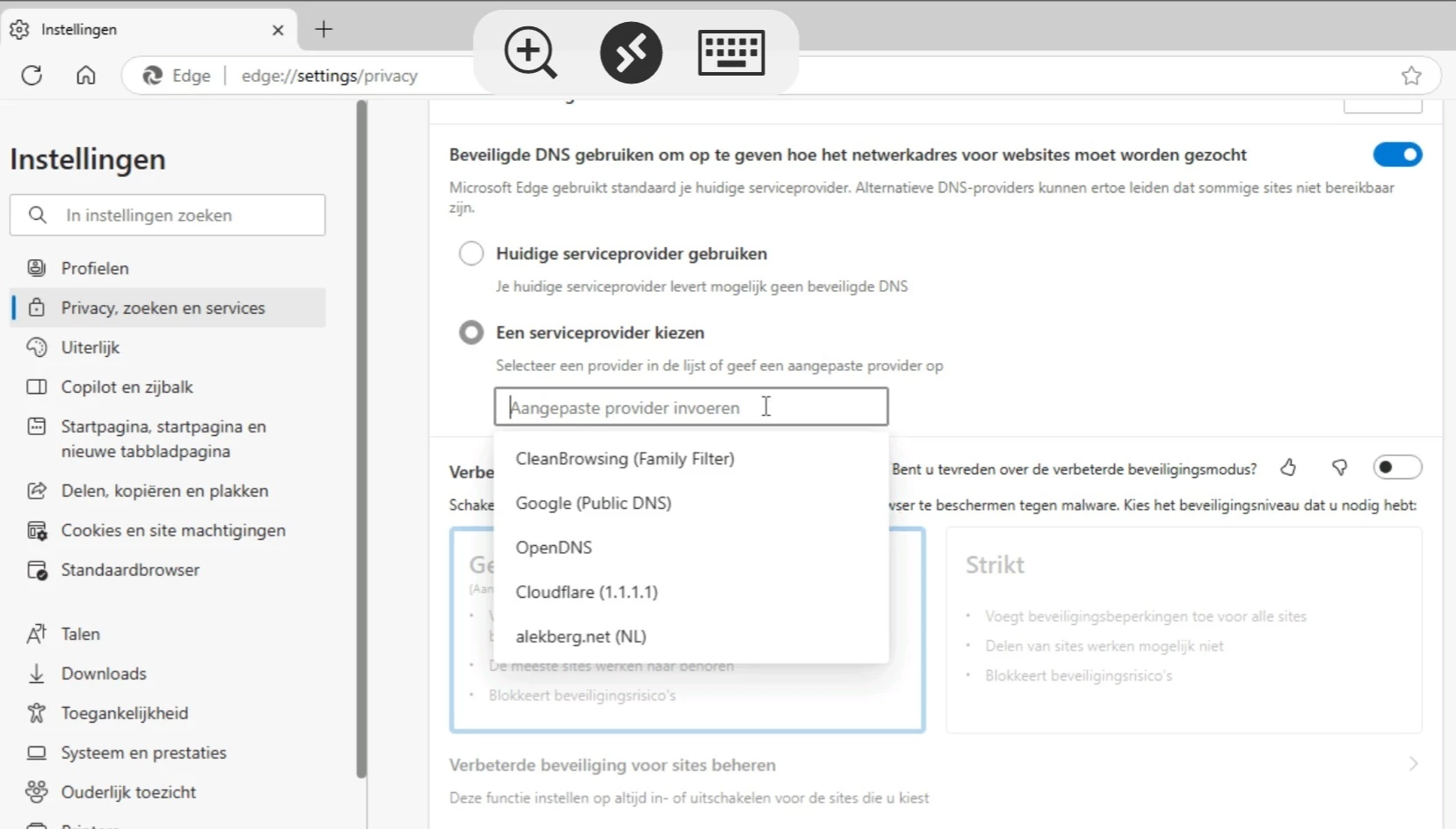 Dan kiezen voor beveiligde DNS gebruiken. Onderste bolletje aanklikken. Dan op het lege invoerveld klikken. Dan krijg je een lijstje met opties. Kies er 1 uit.