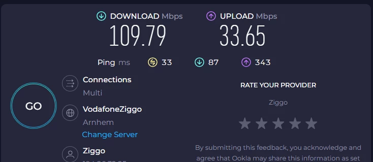 Ik zie trouwens dat de speedtest met die VPN ook Ziggo gebruikt. Dat kan natuurlijk, als er op je werk ook internet van Ziggo is. Of misschien ging de speedtest toch niet over de VPN. Als je wilt weten of bijvoorbeeld browserverkeer via de VPN gaat, kijk dan even wat showmyip.com laat zien, op zowel je werklaptop als op een privé-apparaat. Als het IPv4-adres dan hetzelfde is, dan gaat browserverkeer niet over de VPN. En dan gaan dingen als Zoom/Teams misschien ook niet over de VPN. 🤓