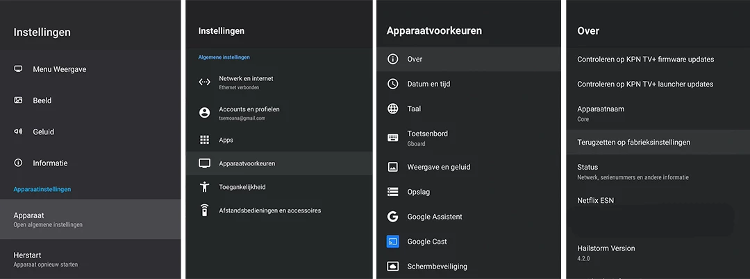 Kies voor Apparaat (open algemene instellingen), Apparaatvoorkeuren, Over en dan Terugzetten op Fabrieksinstellingen.