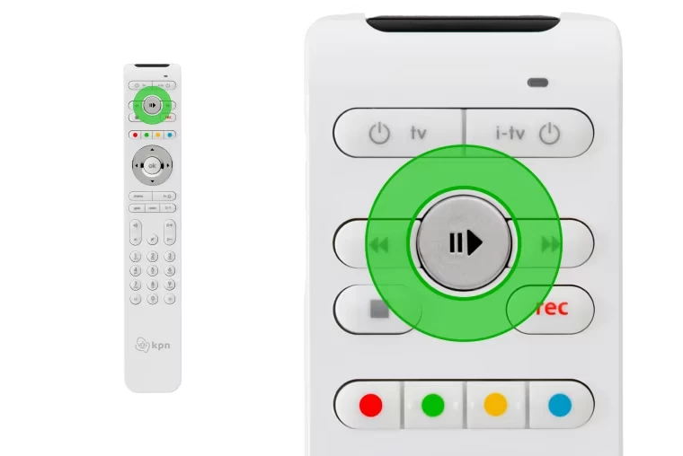 Deze afstandsbediening is voor de KPN tv-ontvanger en heeft een witte achterkant. En in het midden aan de voorkant een ronde knop waarmee je kan pauzeren en afspelen.