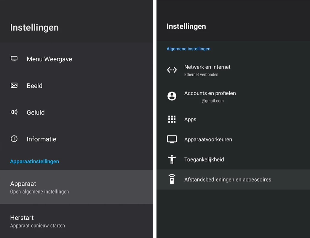 Kies voor Apparaat (Open algemene instellingen) en ga naar Afstandsbedieningen en accessoires.