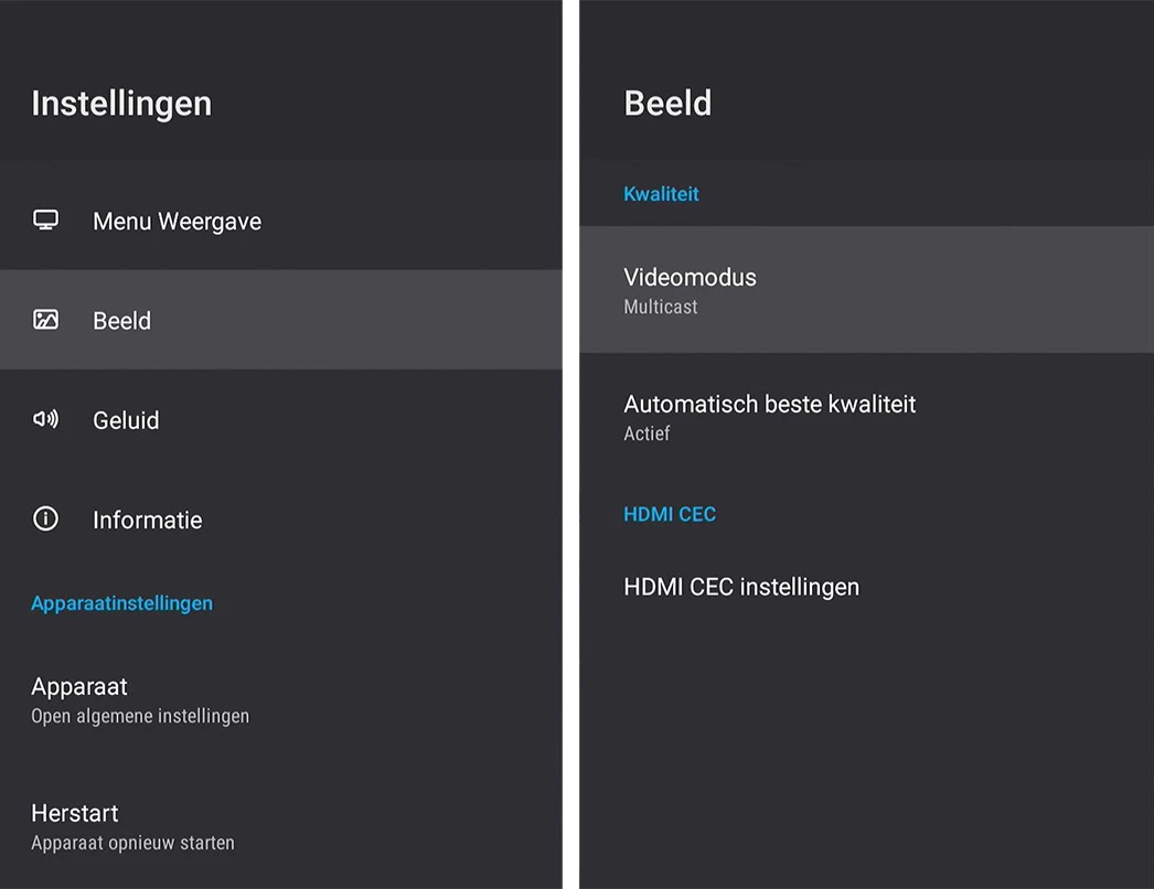 De eerste optie die je hier zit is Videomodus. Daar kun je aanpassen of het signaal voor live kijken via multicast of unicast bij je binnenkomt. Standaard staat dit op multicast. We raden ook aan om dit hierop te laten staan.