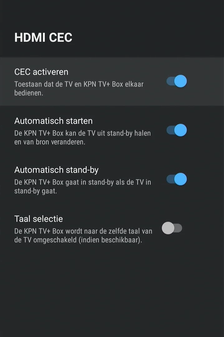 • CEC activeren. Deze optie moet je aanzetten als je een van de volgende opties wilt gebruiken. Dit zorgt ervoor dat de TV+ Box en je TV elkaar kunnen bedienen.