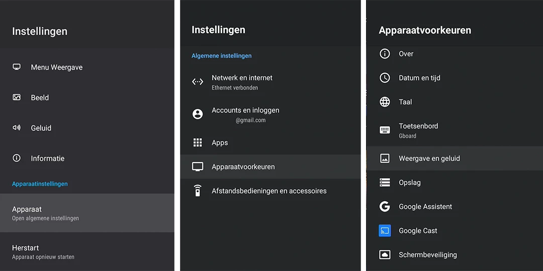 Open de Instellingen en ga, bijna helemaal onderaan, naar Apparaat (Open algemene instellingen). Kies dan voor Apparaatvoorkeuren, en vervolgens voor Weergave en geluid.