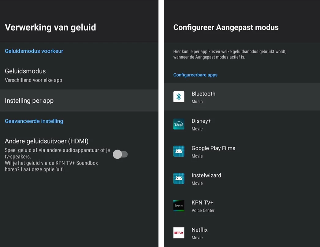 Met deze optie kun je instellen dat het geluid wordt afgespeeld via andere audioapparatuur of je tv zelf.