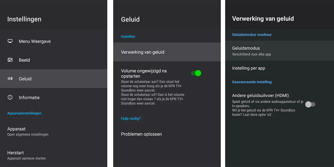 Vanuit de nieuwe Europese regels rondom toegankelijkheid start de TV+ Soundbox standaard op met geluidsniveau 7. Wil je liever dat je eigen ingestelde geluidsniveau wordt vastgehouden? Zet dan deze optie aan.