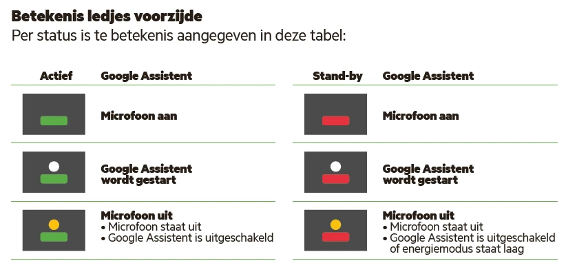 Het stand-by lampje is rood als de Box uit staat, en groen als de Box aan is. Het lampje van de Google Assistent kan wit of oranje branden, of uit zijn.