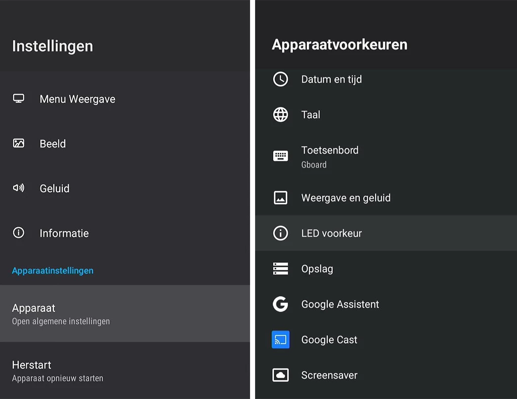 Kies vervolgens Apparaat en ga daarna naar LED voorkeur: