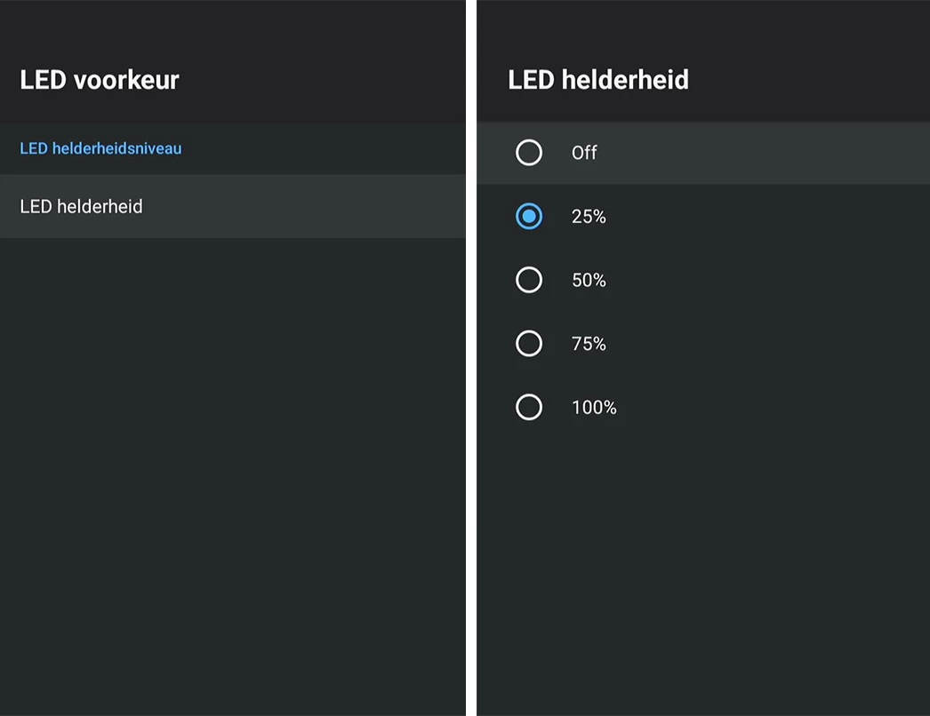 Dan kies je LED helderheid. Hier kan je kiezen: kies een gewenst percentage of uit.