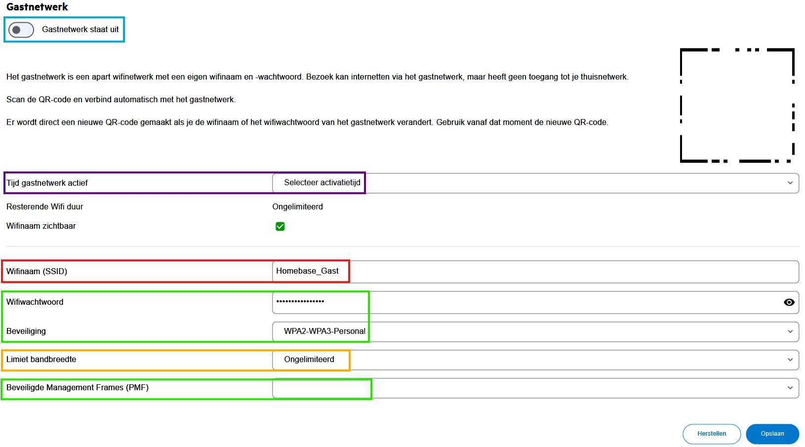 In het paarse blok kun je instellen hoe lang het gastnetwerk actief blijft. Na afloop van de tijd zal het gastnetwerk automatisch weer uitgeschakeld worden. Je kunt hier kiezen uit waardes van 1 tot 48 uur, en ongelimiteerd. Bij ongelimiteerd blijft het gastnetwerk aan tot je het zelf weer uitzet.