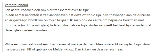 Wil je een concreet voorbeeld bespreken of merk je dat berichten onterecht verwijderd zijn, stuur me gerust een PB of gebruik de Melden-knop. Dan kijken we daar serieus naar.