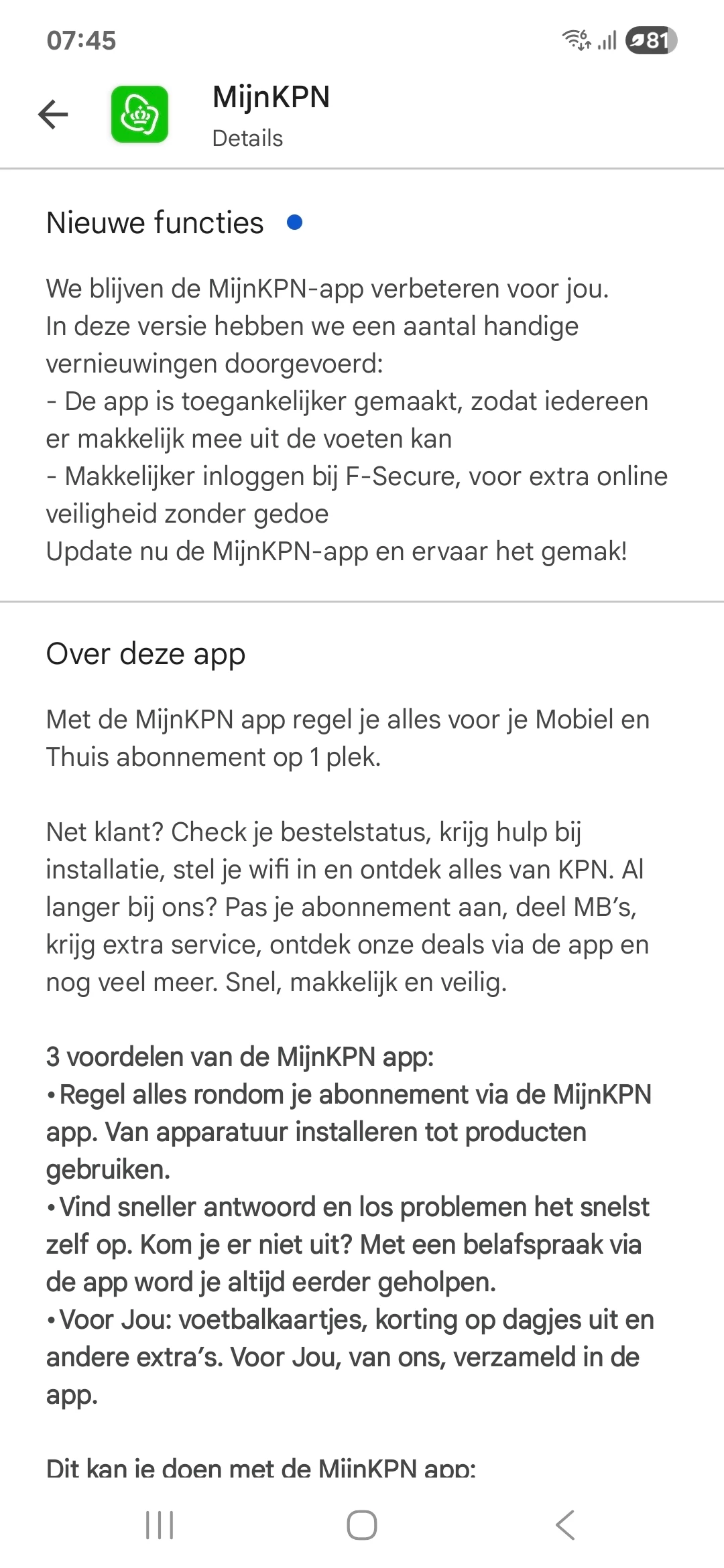 Systeem werkt niet mee. 👎 Sorry. Niet voor de klanten en medewerkers van KPN bedoeld maar om het domme systeem van Mijn KPN. IK ga als ik vanavond als ik met mijn eigen KPN netwerk verbonden ben met smartphone A56 het opnieuw proberen. Lukt het dan nog niet dan moet de ontwikkelaar van Mijn KPN met een nieuwe update van Mijn KPN gaan komen in Google Play store. Ik ga geen reactie bij Mijn KPN in Google Play store plaatsen. Dan zegt binnen de kortste keren dat de reactie met antwoord van de ontwikkelaar in Google Play store wel in tablet Galaxy Tab A8 van Samsung te zien is en in de smartphone A56 en niet in smartphone S21 FE van Els. Of wel te zien is in smartphone S21 FE van Els en de tablet en niet in de smartphone A56. KPN, ik ga hiervoor de domme robot niet bellen. Die is de domste pestkop op aarde. En niet alleen KPN heeft dat. Ook Microsoft heeft dezelfde robot dat als ik zeg Outlook dat de robot zegt, "sorry dat begrijp ik niet. Belachelijke computers wat ik vrijdag 22 augustus ontdekte telefonisch met Microsoft. KPN, jullie modem is super! Maarcdit niet. Super stom!