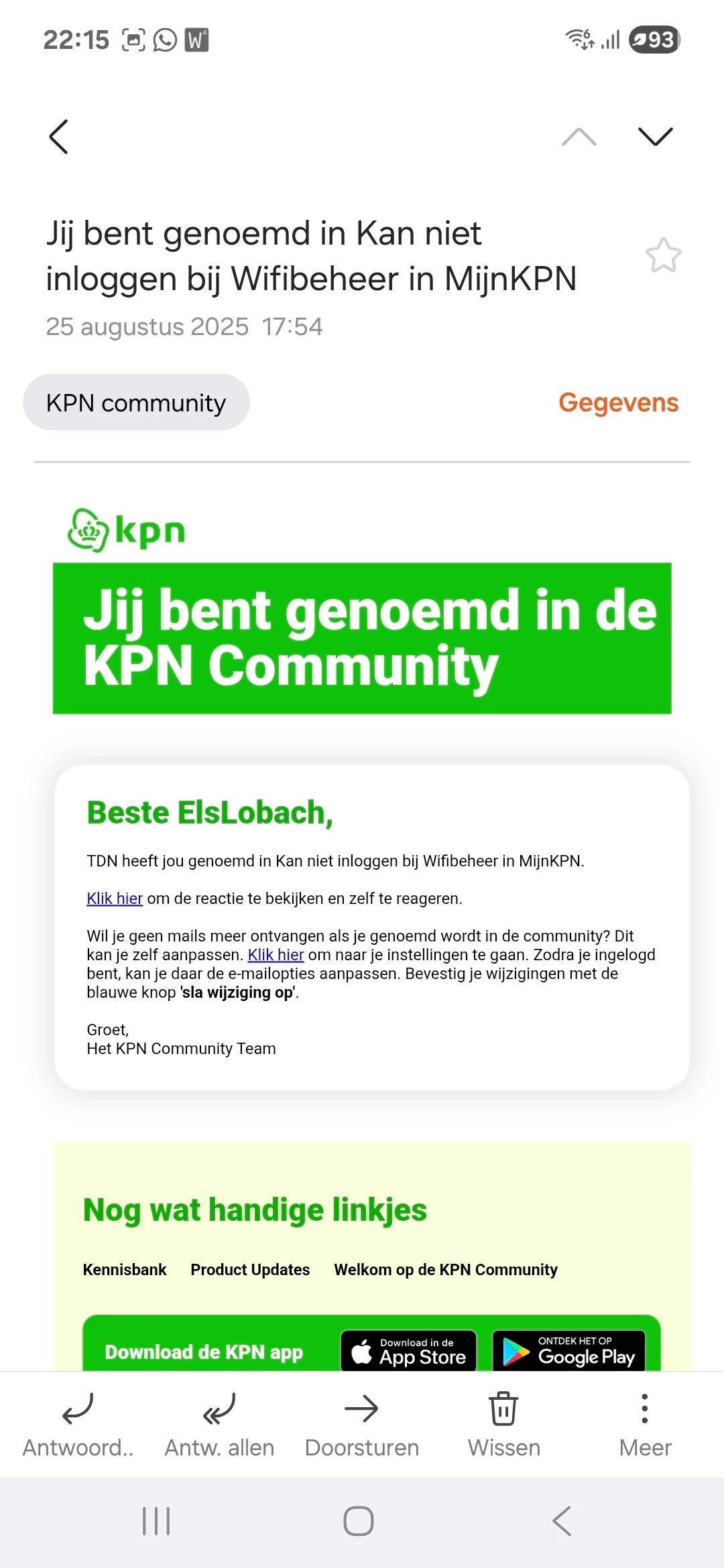 @ElsLobach Ik wil je allereerst vragen om vooral rustig te blijven. De KPN Community is er om jou te helpen. Wij moderators lezen altijd mee, maar soms kan het even duren voor we aan een topic toe komen. Het beste is dan om gewoon rustig te blijven. Of, als het haast heeft, contact met onze klantenservice op te nemen. Dit kan door een belafspraak te maken of contact op te nemen via een van onze socials: Instagram, Facebook, Bluesky of X.